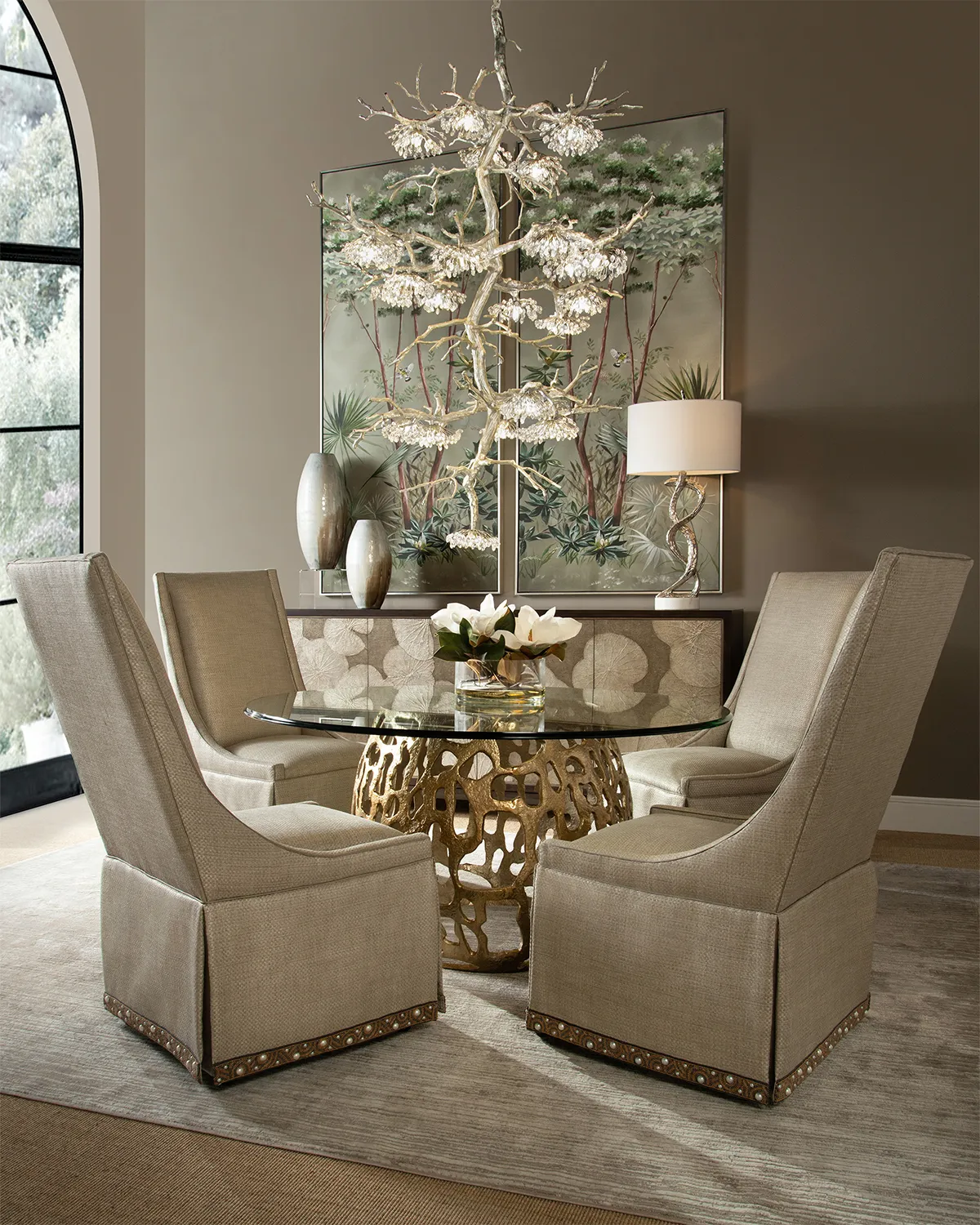 An organic cast aluminum dining table base with an antique gold finish gives aesthetic interest with its free-form cutout pattern.