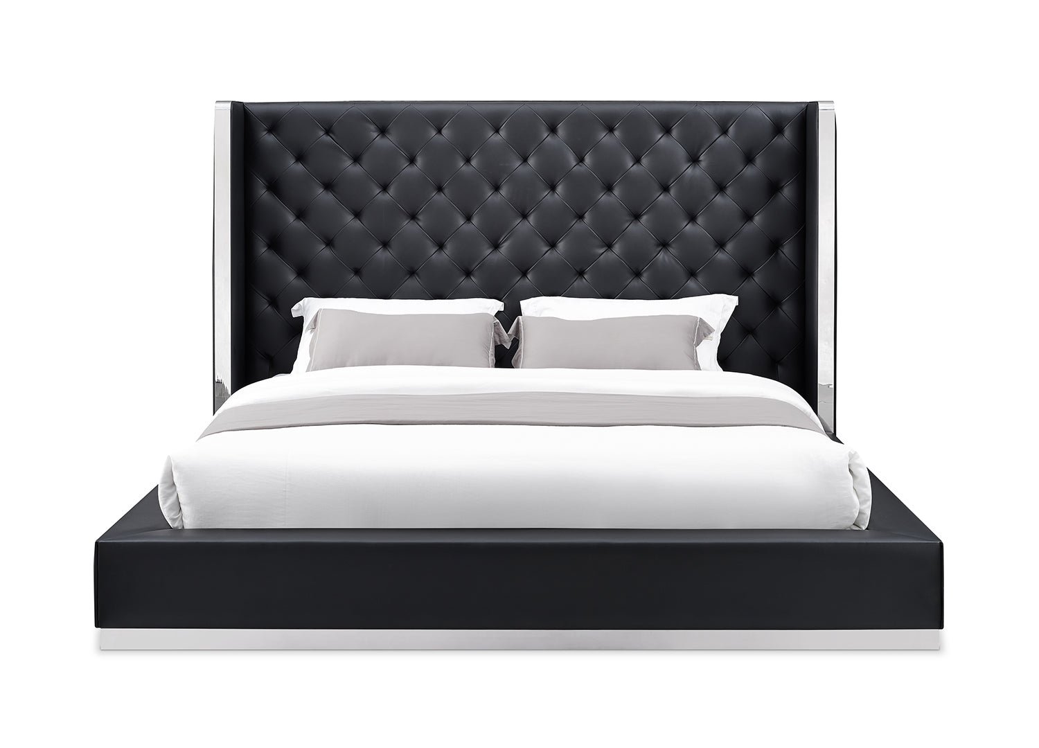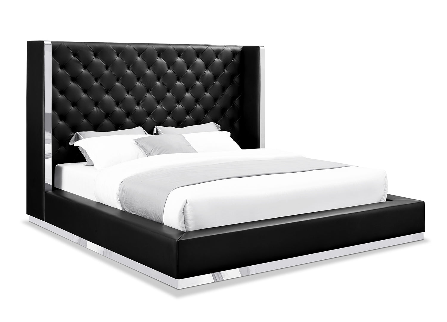 Fully Upholstered in White or in Black Faux Leather, Tufted Headboard with Polished Silver Stainless Steel Side-Panels, Base in Polished Silver Stainless Steel.