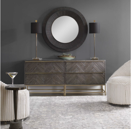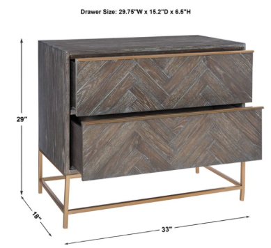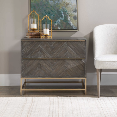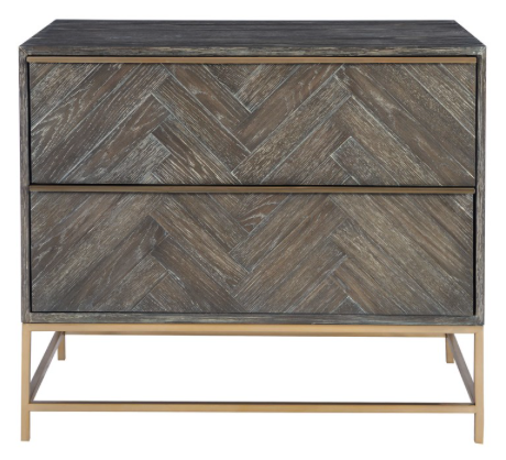 Showcasing understated style, this two drawer chest is layered in a dark walnut finished oak veneer accented with herringbone drawer fronts. Rests on a steel base in plated brushed brass with coordinating drawer pulls.