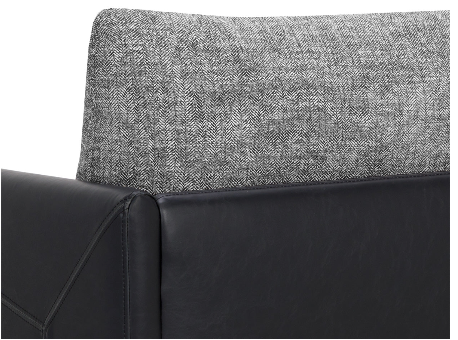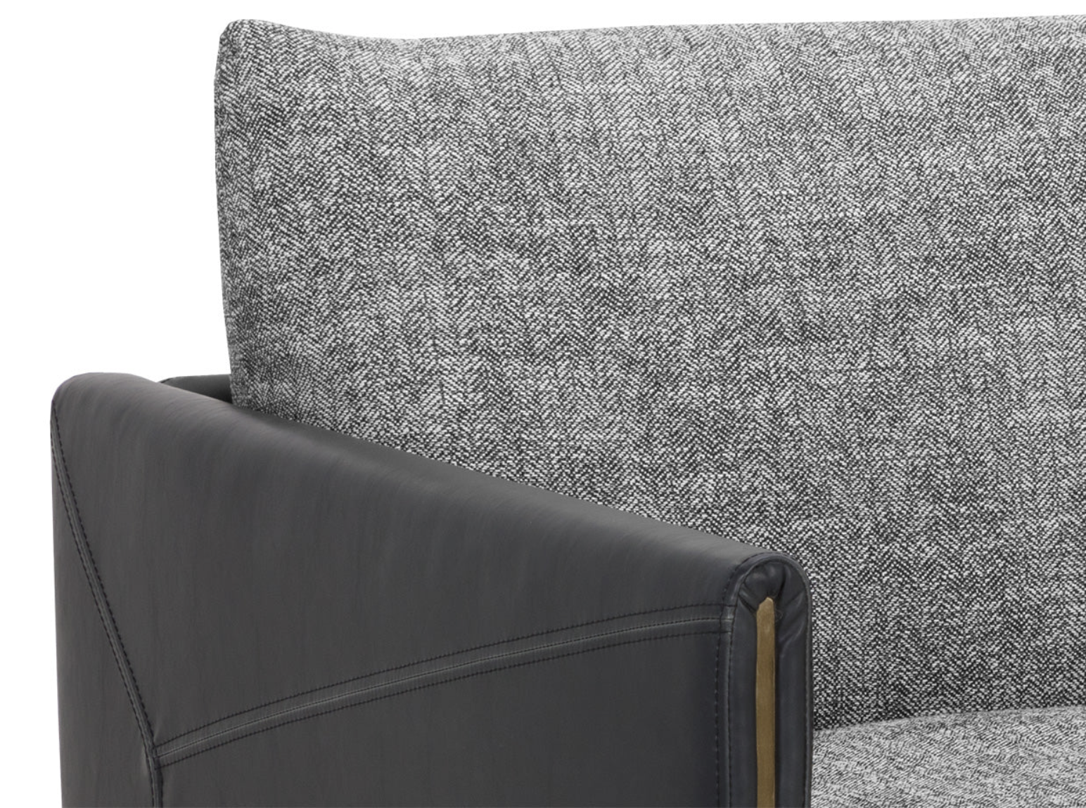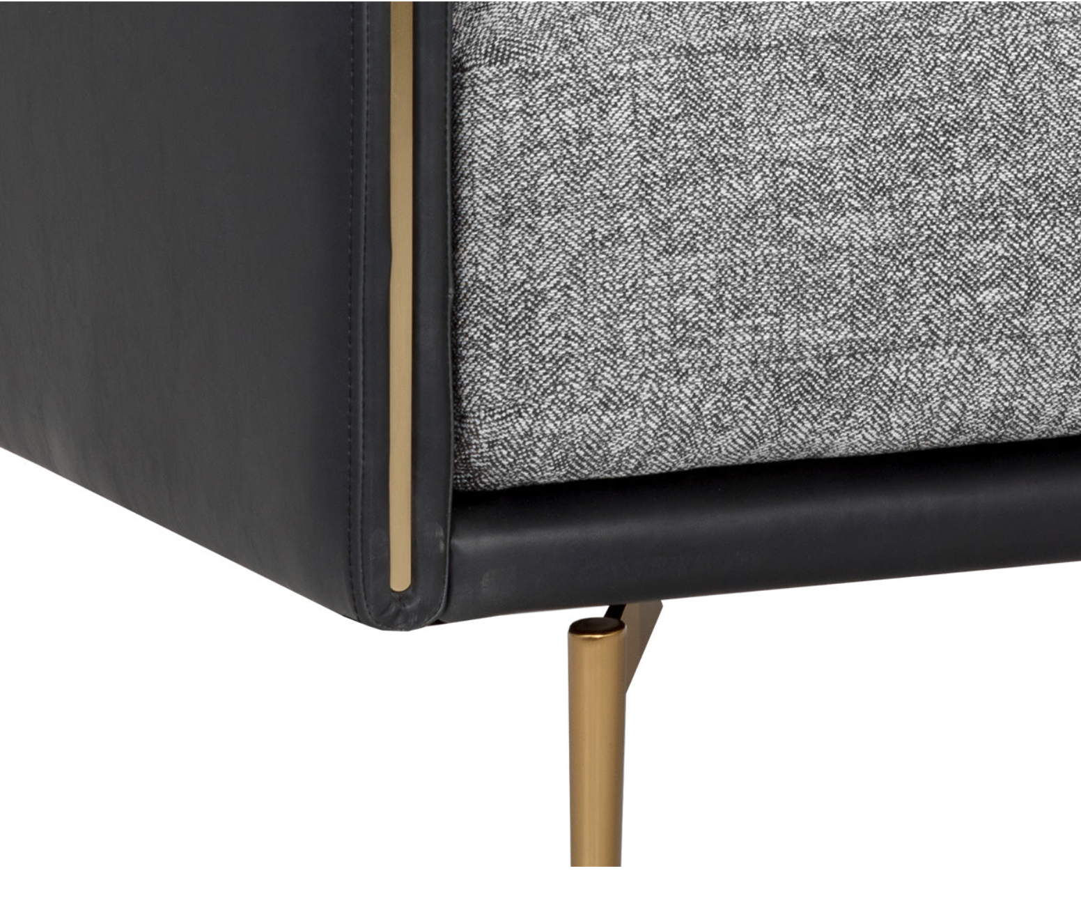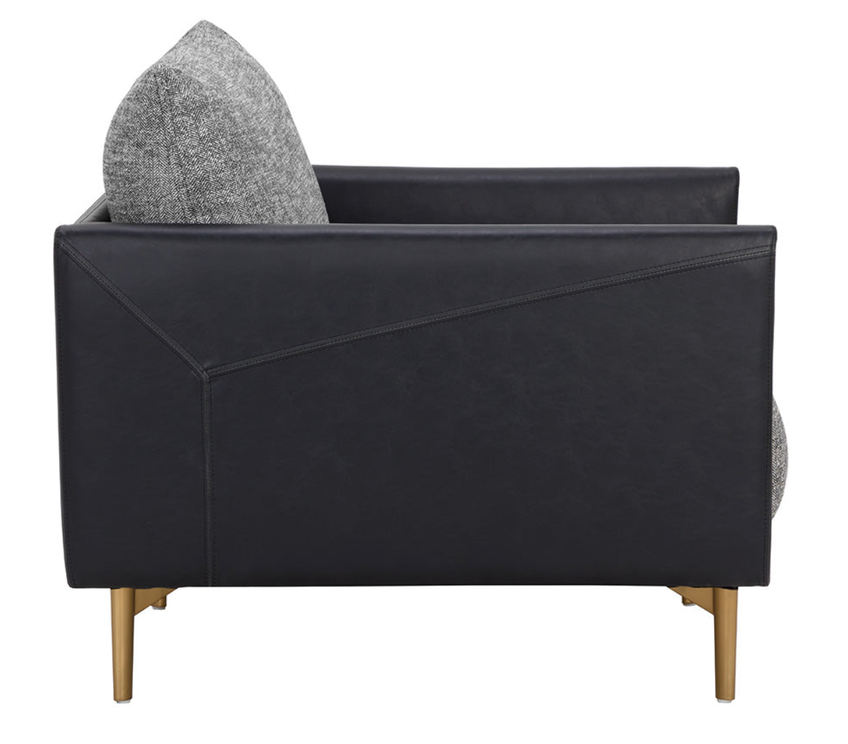 Mixed materials and contrasting colours give the Ashi Armchair an elevated design. Soft cushioning upholstered in nash zebra fabric provides ample comfort. Stitched detailing on the side of the arms gives a subtle geometric design that enhances the coal black faux leather frame. Satin brass aluminum on the legs and trim on the front of the arms ties the look together. Handle With Care: This design has been crafted with faux leather. Faux leather is manufactured to reflect the natural characteristics of leather; as such, colour variations, markings, wrinkles, grooves, and light scratches are appreciated characteristics. No two pieces will be alike. Visit our Product Care page for more information on how to ensure the lasting beauty of this piece.