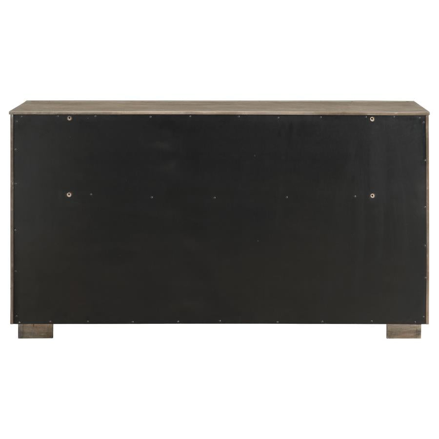 An asymmetric centerline creates a touch of artistry for this transitional eight-drawer dresser. Designed for spacious storage of clothing and accessories, it features drawers of varying sizes, creating easy organization. A Taupe oak wood finish is soft and neutral, perfect for a variety of bedrooms. Extra-long bar drawer pulls meet in the center, delivering a seamless sensibility to the front of the case, which boasts mitered trim for added dimensionality. Choose the perfect array of decor and personal items for the top.