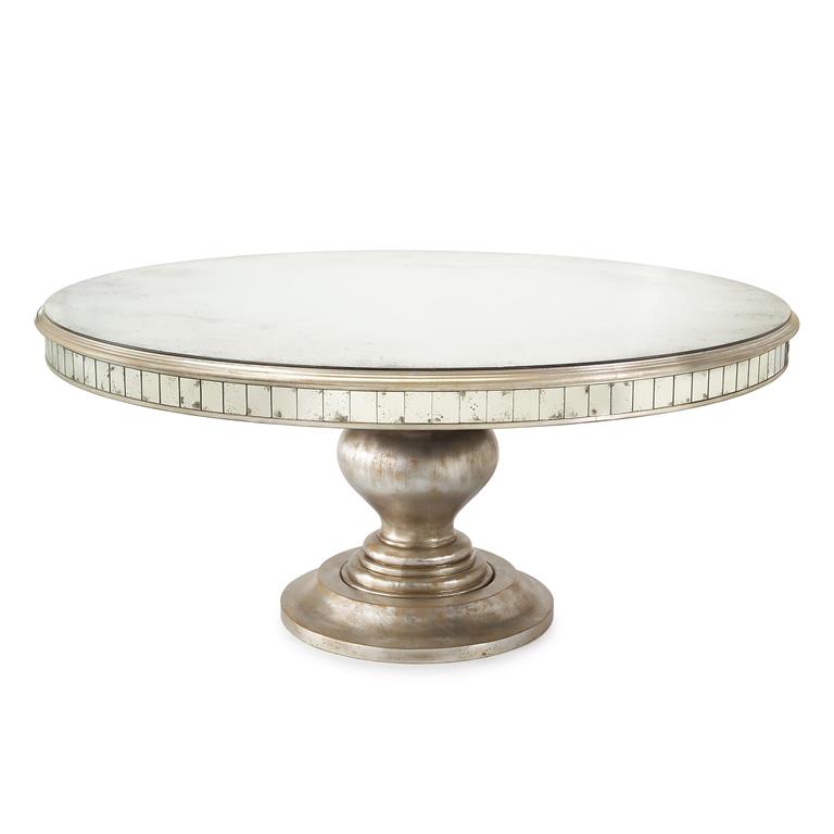 The turned, bulbous column and edge details are finished in Parisian silver, while the apron rail is inset with antiqued mirror tiles, above which there is a foxed mirror top.