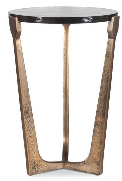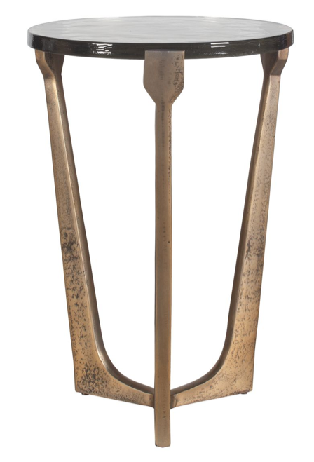 Crafted from a combination of antique brass finished cast aluminum and rich cast glass, this accent table showcases exquisite craftsmanship. The warm tones of the brass frame complement the unique texture of the glass top, creating a truly captivating piece. Suitable for both indoor and outdoor use.