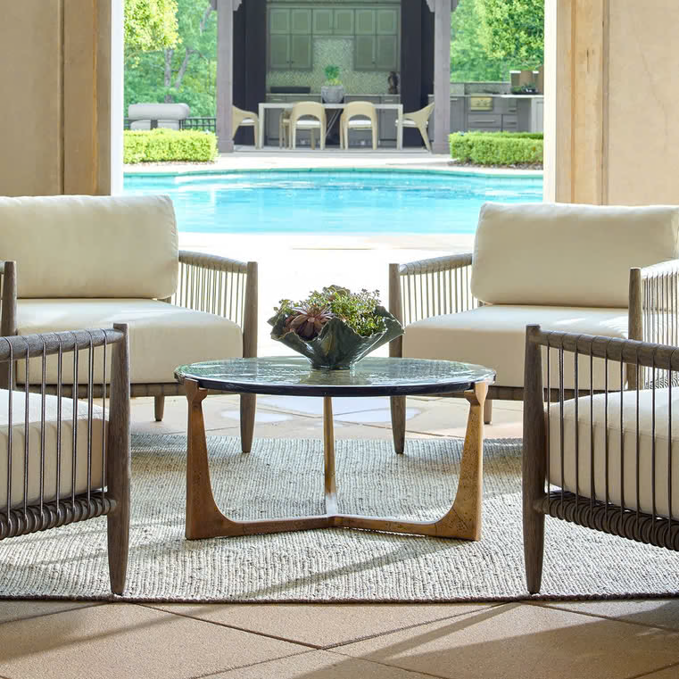 Crafted from a combination of antique brass finished cast aluminum and rich cast glass, this coffee table showcases exquisite craftsmanship. The warm tones of the brass frame complement the unique texture of the glass top, creating a truly captivating piece. Suitable for both indoor and outdoor use.