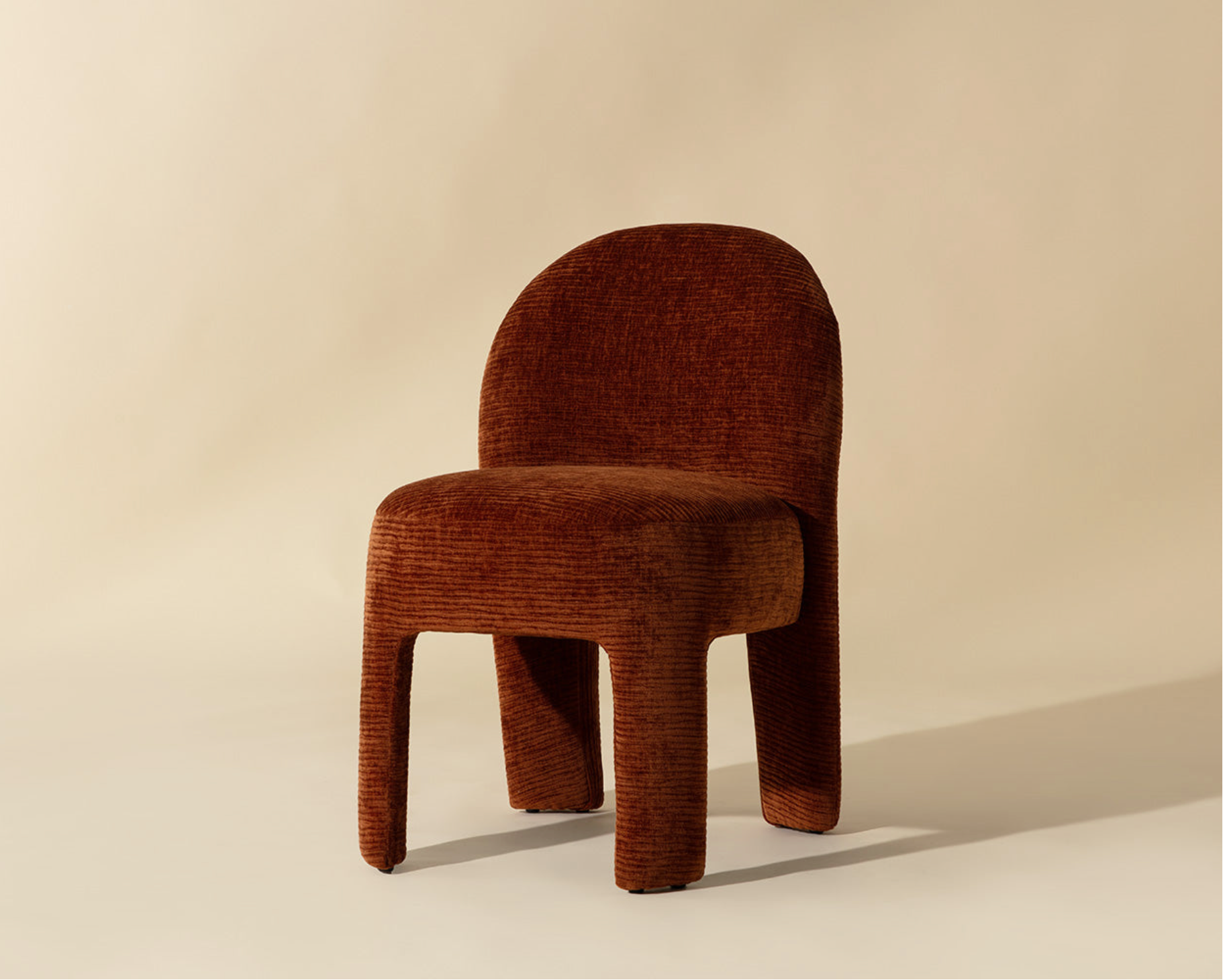 Enjoy the trendy and plush lines of the modern Myrtle Dining Chair. Artfully upholstered in rich textured opera spice fabric, this masterfully-built dining chair is a true meeting of style and comfort with its sleek and modern curves and contours.