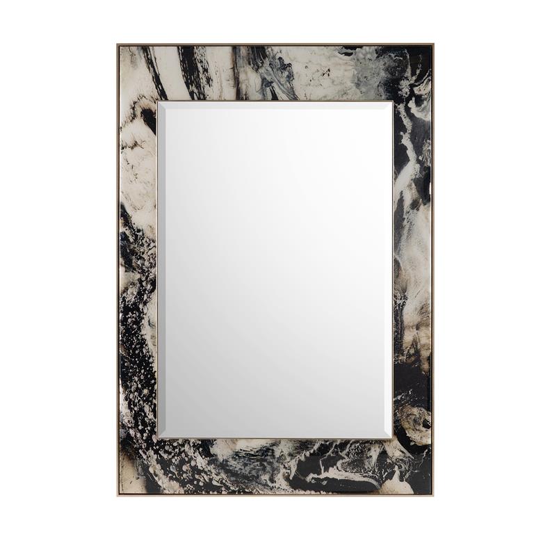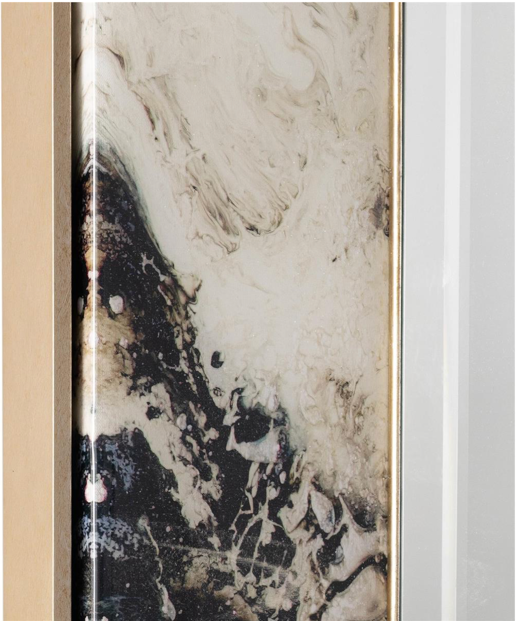 Hypnotic by artist Brendan Parker is featured on this stylish mirror. Swirls of black, white, and brown create a dynamic sense of motion, heightened by a glossy vitreous finish and subtle metallic accents that add layers of texture. The artwork is presented with a beveled mirror, nested within a sleek Champagne Silver frame, designed for both vertical and horizontal display.