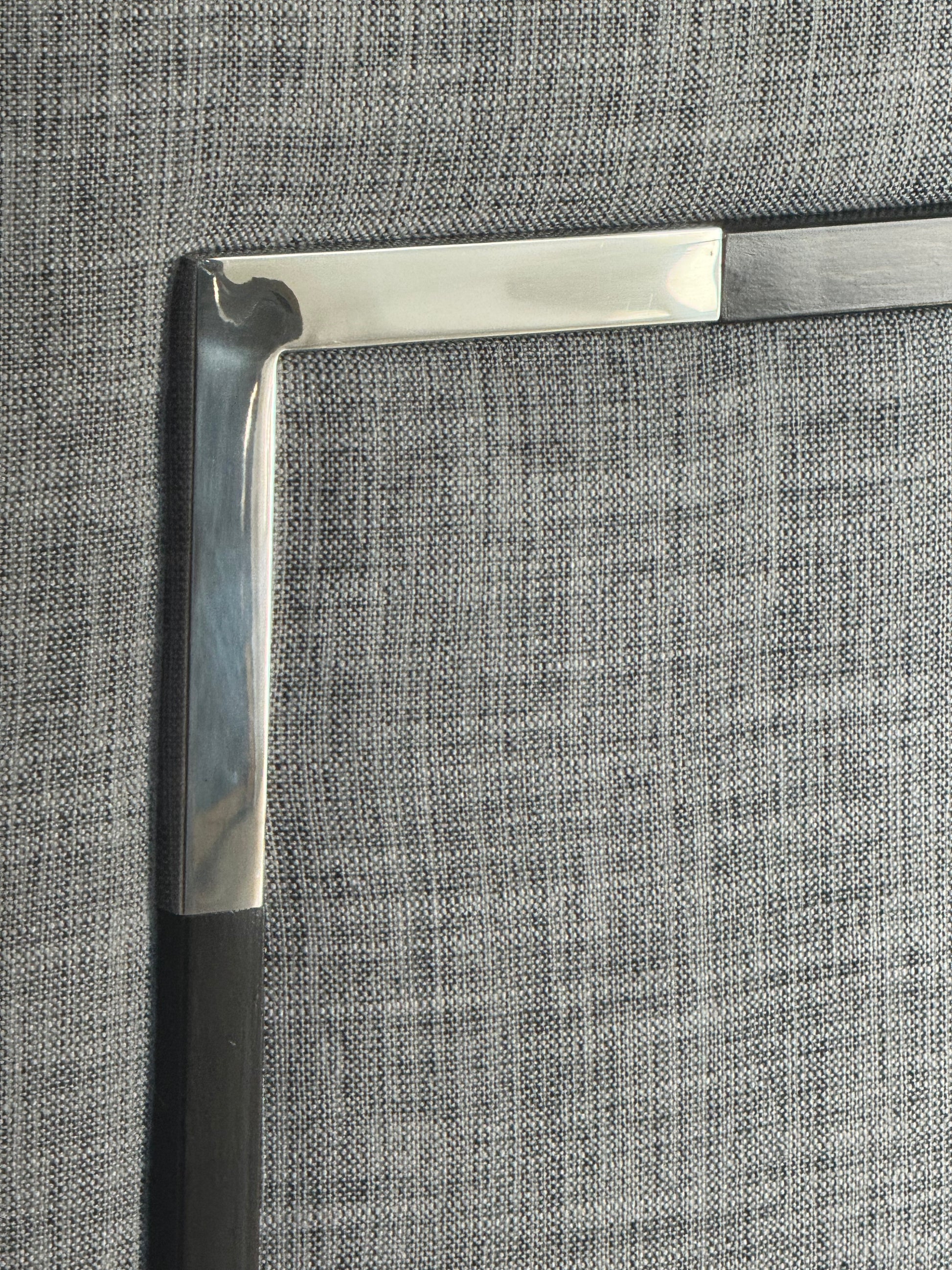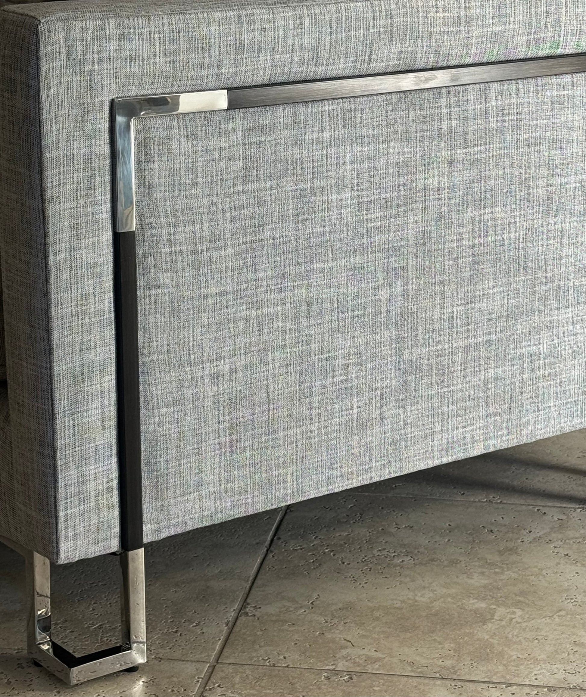 A definitive tastemaker, this exceptional sofa has all the right stuff. Its simple silhouette is accentuated by a stainless-steel and tungsten-plated frame with a two-tone finish. This innovative design gives the sofa a suspended look and creates a light and airy visual. Tailored in a palette of moonlight silver with hints of metallic, its body fabric has a subtle menswear look. Accent pillows in a shimmering diamond geometric pattern add a subtle layer of luxe texture while maintaining its artful appeal.