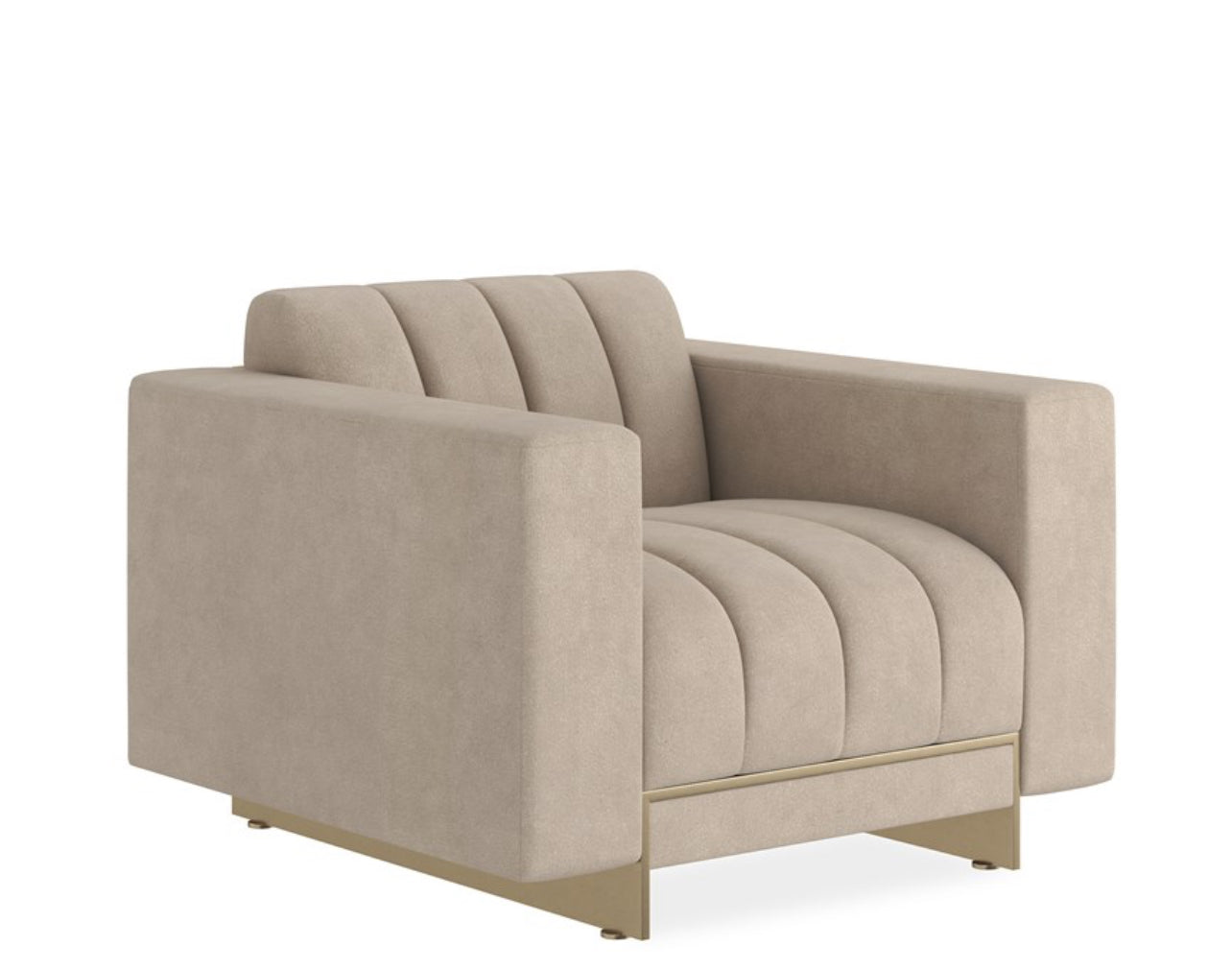 Elegance and sophistication align in this beautifully tailored channel-tufted chair. Upholstered in a luxurious basketweave fabric in a shimmering Moonstone hue, it rests atop a thin Majestic Gold framework making it appear lighter than air. A Majestic Gold top rail and vogue detailing like the Majestic Gold beading that runs down the back of the framework, give this chair a sophisticated presence. Its arms are the perfect height for resting or reading. Pair this chair with The Well-Balanced Ottoman for a comfortable reading chair or consider a pair of chairs for a cozy niche.