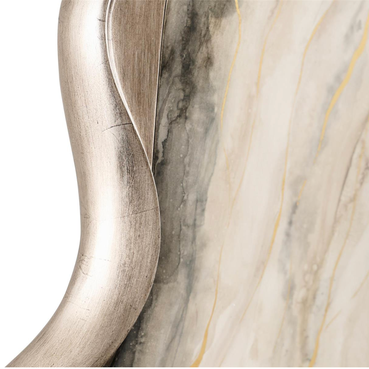 The Dirillo Mirror is a magnificent statement piece that commands attention. Made of glass, this mirror is imbued with a Grey Agate finish, giving it the appearance of natural agate stone. Organic banding patterns border a gorgeous beveled mirror at the center. Surrounding the geode's perimeter is an organic ebb and flow finished in a rich Antique Pewter. This piece is affixed with French cleats and can be displayed in portrait or landscape orientations.