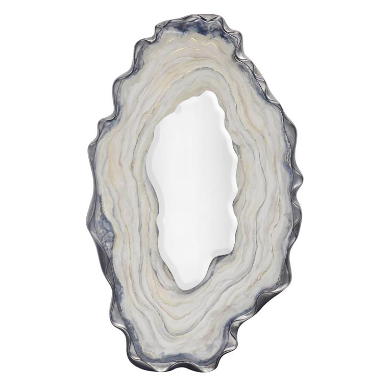 The Dirillo is a magnificent statement piece that commands attention. Made of glass, this mirror is imbued with a Grey Agate finish, giving it the appearance of natural agate stone. Organic banding patterns border a gorgeous beveled mirror at the center. Surrounding the geode's perimeter is an organic ebb and flow finished in a rich Antique Pewter. This piece is affixed with French cleats and can be hung in portrait or landscape orientations