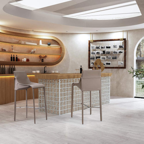 The characteristic light and sophisticated style inspires Edward barstool, expressing the same comfort as traditional seating system. Fully Upholstered in Grey Faux Leather, Footrest in Polished Silver Stainless-Steel.