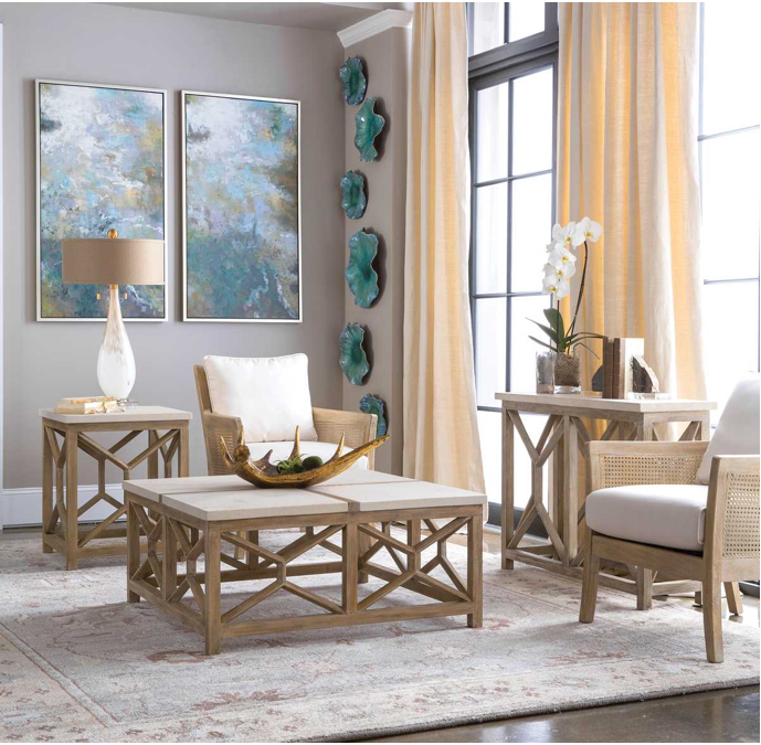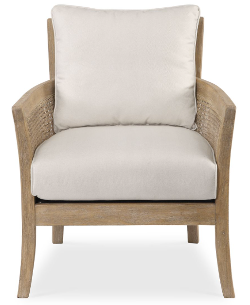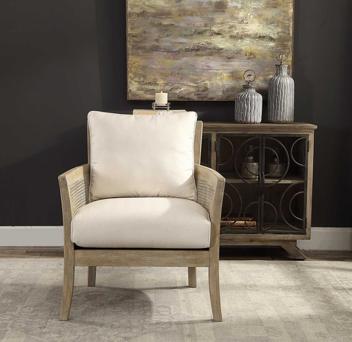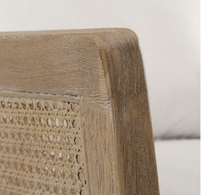 High supportive back and curvy flair arms make a grand style statement in a lightly glazed and bleached sandstone exposed hardwood finish with cane sides, tailored in a durable yet lush off-white fabric with added performance treatment to resist soiling and stains.