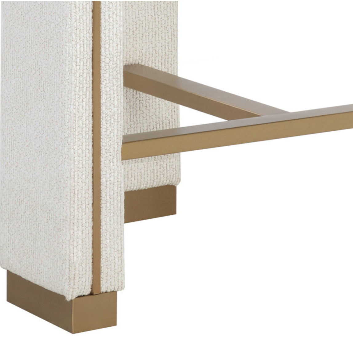 Perfectly poised with a distinct three-legged design, the Erica Stool will leave a lasting impression. Powder-coated gold metal detailing enhances the plush texture of our rhea light barley performance fabric for a stylish seating solution. Performance fabric is moisture repellent, durable and easy to clean.
