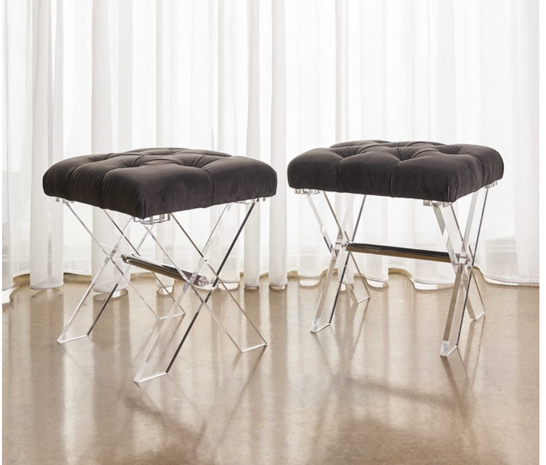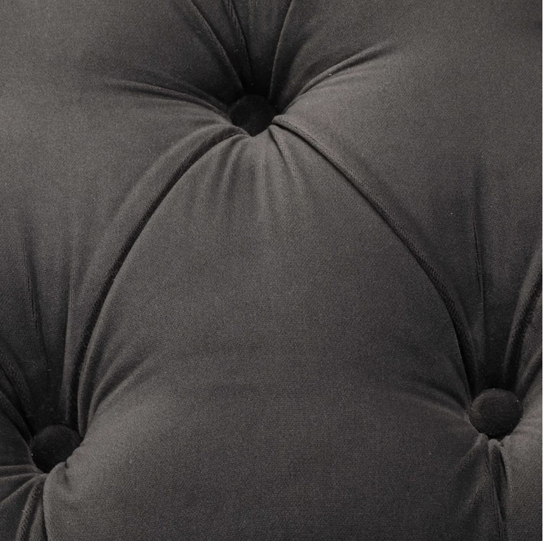 Sleek styling and button tufted seat covered in a lush charcoal velvet, set on an clear acrylic base. Seat height is 20".