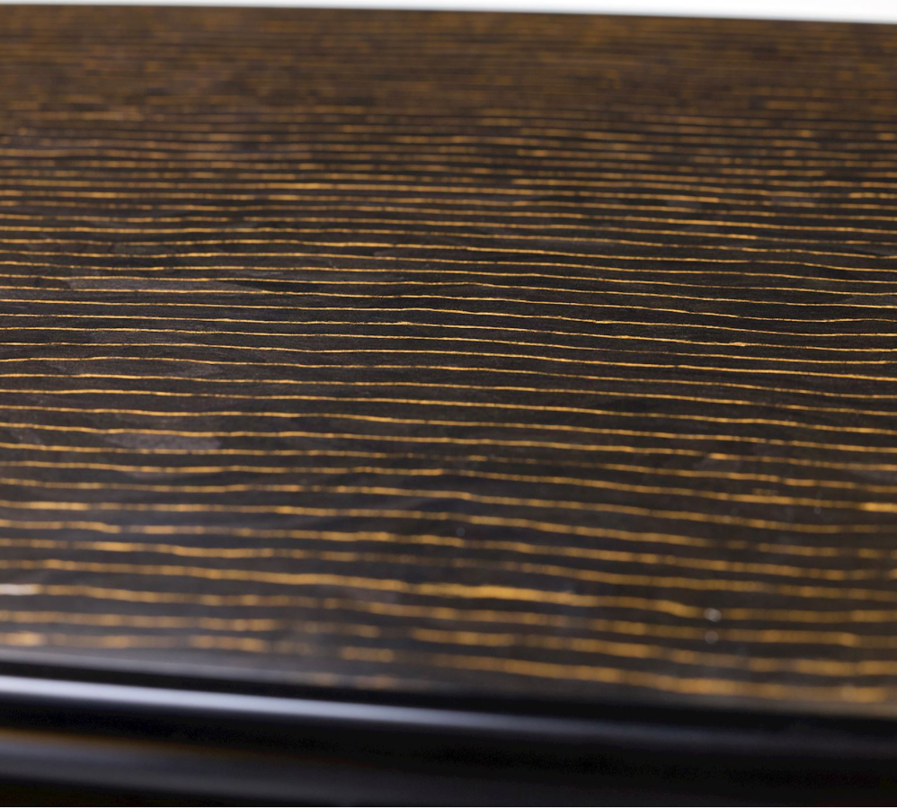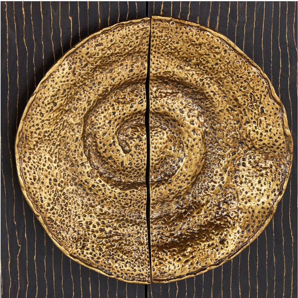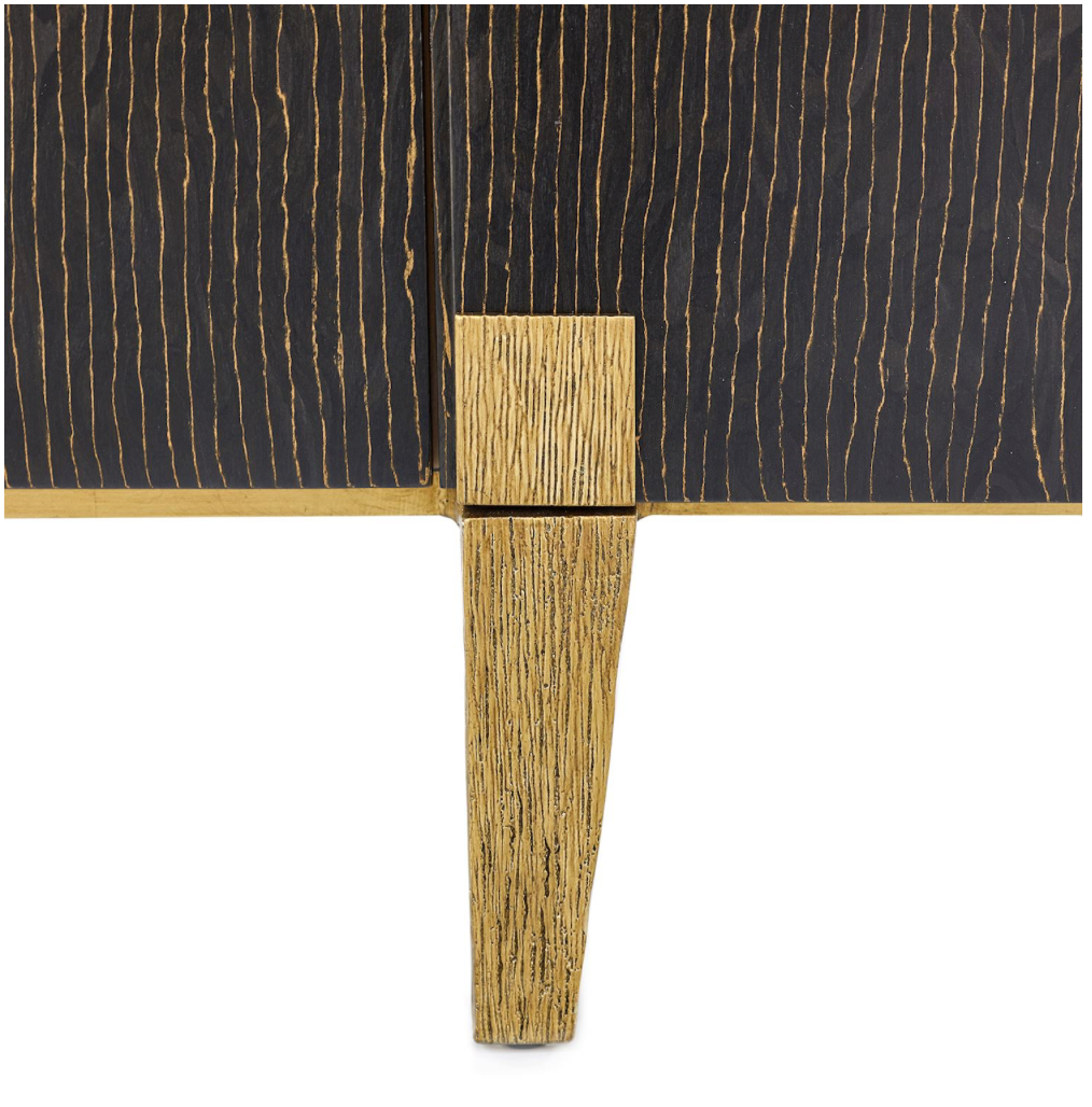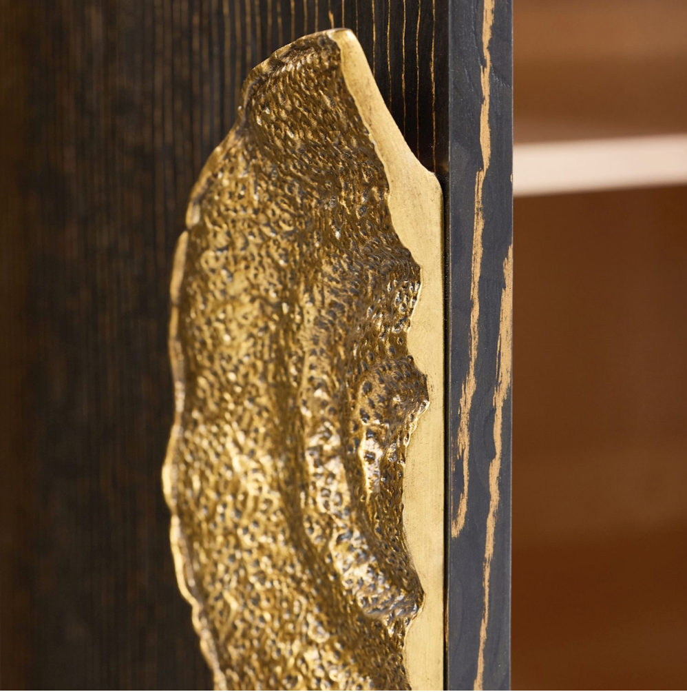The Fiore Credenza is a chic contemporary piece with naturally inspired motifs. Crafted from beech, ebony, and maple woods, the piece features a clear coat finish and showcases subtle texturing. The credenza is supported by eight aluminum legs in an Antique Gold finish, beautifully complementing the dark tones of the body. The piece displays six doors, with two affixed with aluminum handles in Antique Gold depicting a gorgeous floral design. Four single compartments and one double compartment all come with a single adjustable shelf.