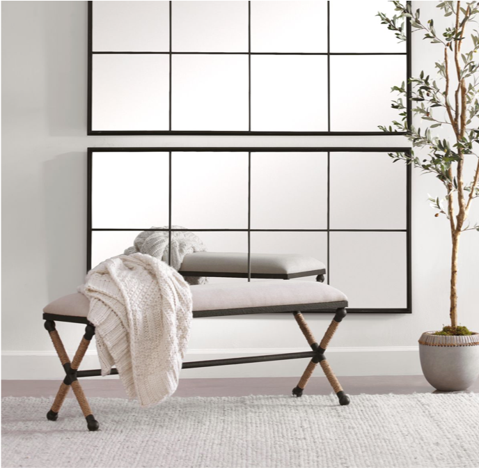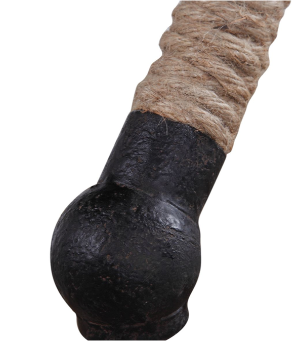 Rustic iron frame with a nautical touch, wrapped in natural fiber rope accents. Cushioned top is a sturdy, cotton in a neutral oatmeal.