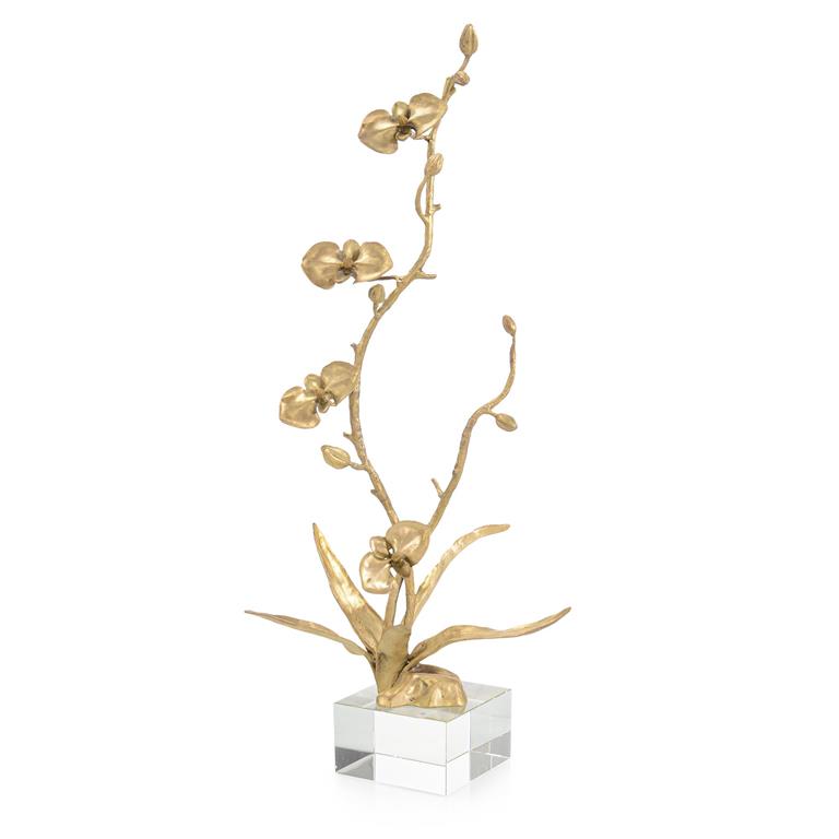 A stunning interpretation of nature, the Floral Spire sculpture depicts a tall, flowering metal plant in an antique brass finish. The piece rests gently atop a square base of clear crystal, playfully juxtaposing the metallic tones.
