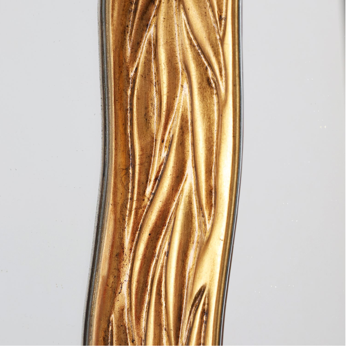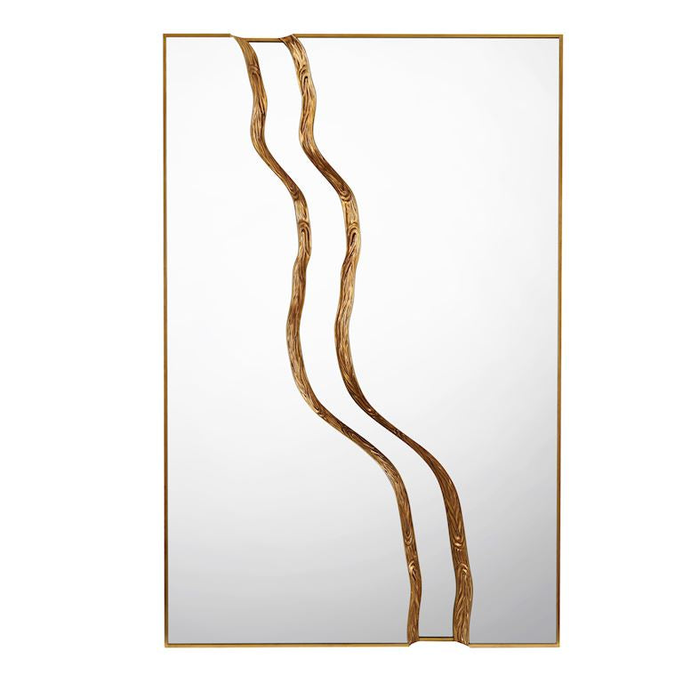 The Flume Mirror is a gorgeous piece that evokes the power and beauty of a natural river. This rectangular mirror showcases a dimensional effect with a flowing motif that runs from top to bottom, featuring raised edges in a stunning Exotic Gold finish. The rest of the mirror lays flush with the raised edges of the riverbed. The look is completed with a gold beech wood frame.