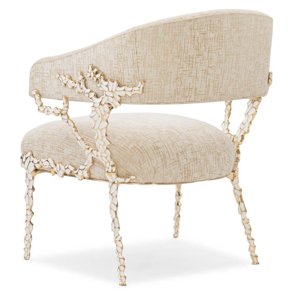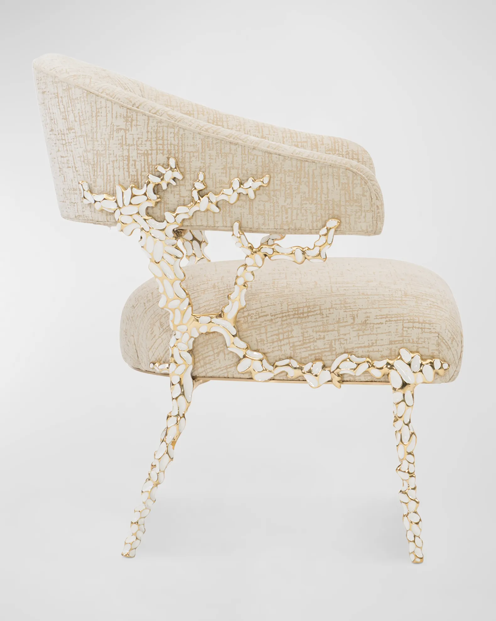 Bold in character, this dazzling chair is unique in every way. Its one-of-a-kind shape was born from design exploration of the organic beauty and inspiration found in nature. Cast in solid brass and finished in Gold Brush with white enamel, it has the feel of branches or coral reaching up toward the light. Richly upholstered in a soft, textured neutral, this remarkable creation conveys an attitude of modern opulence.