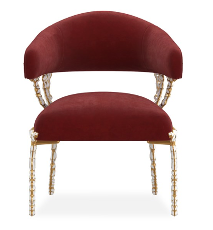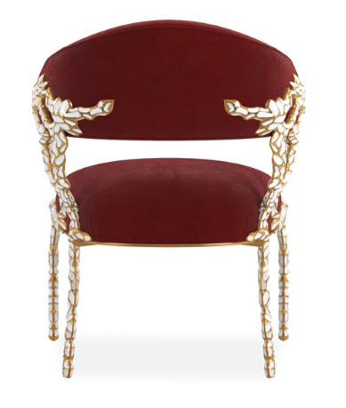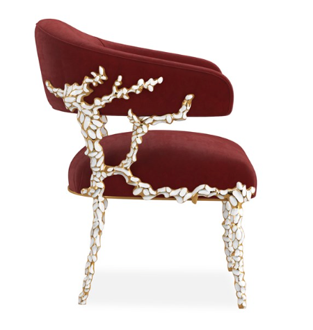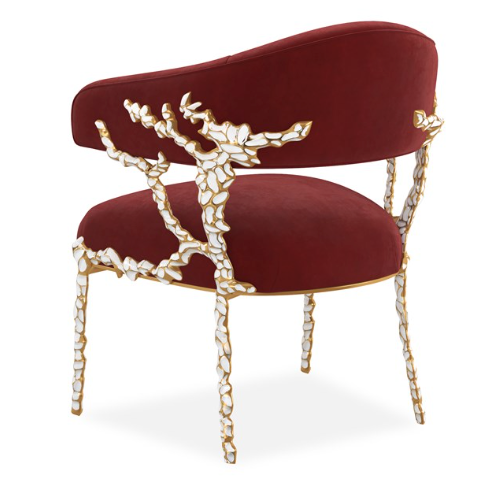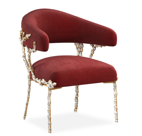 Bold in character, this dazzling chair is unique in every way. Its one-of-a-kind shape was born from design exploration of the organic beauty and inspiration found in nature. Cast in solid brass and finished in Gold Brush with white enamel, it has the feel of branches or coral reaching up toward the light. Richly upholstered in a soft, textured neutral, this remarkable creation conveys an attitude of modern opulence.