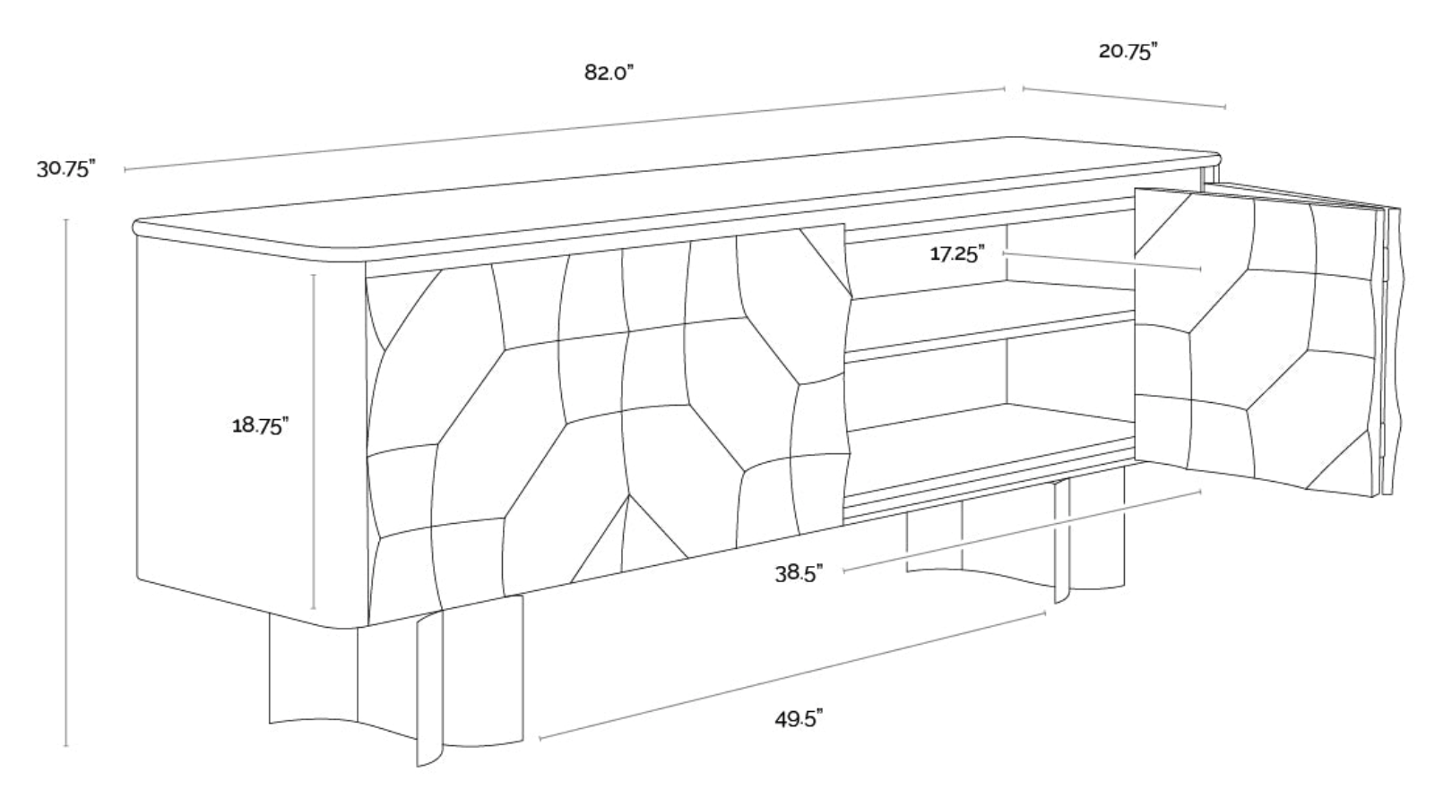 Bold design and mixed materials establish the modern presence of the Global Sideboard. Crafted with stainless steel and a stunning cream marble top, the Lautrec features captivating textural forms on the front sliding doors. Supported with uniquely curved legs in an antique brass finish.