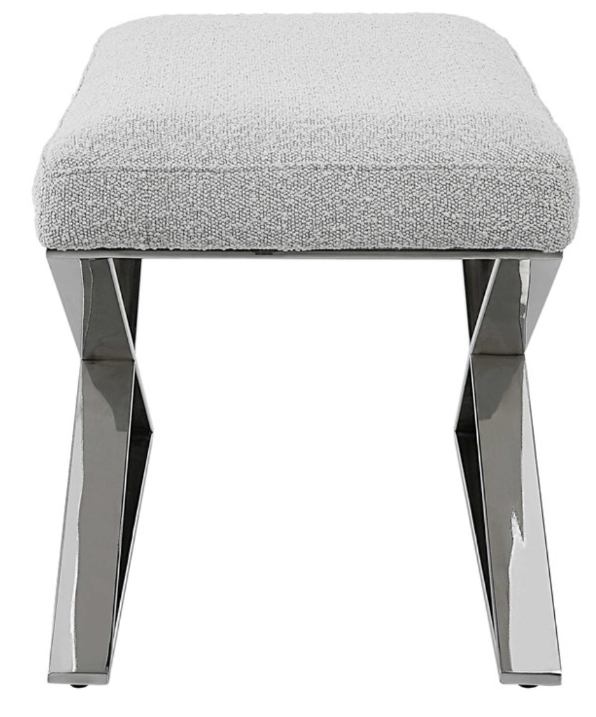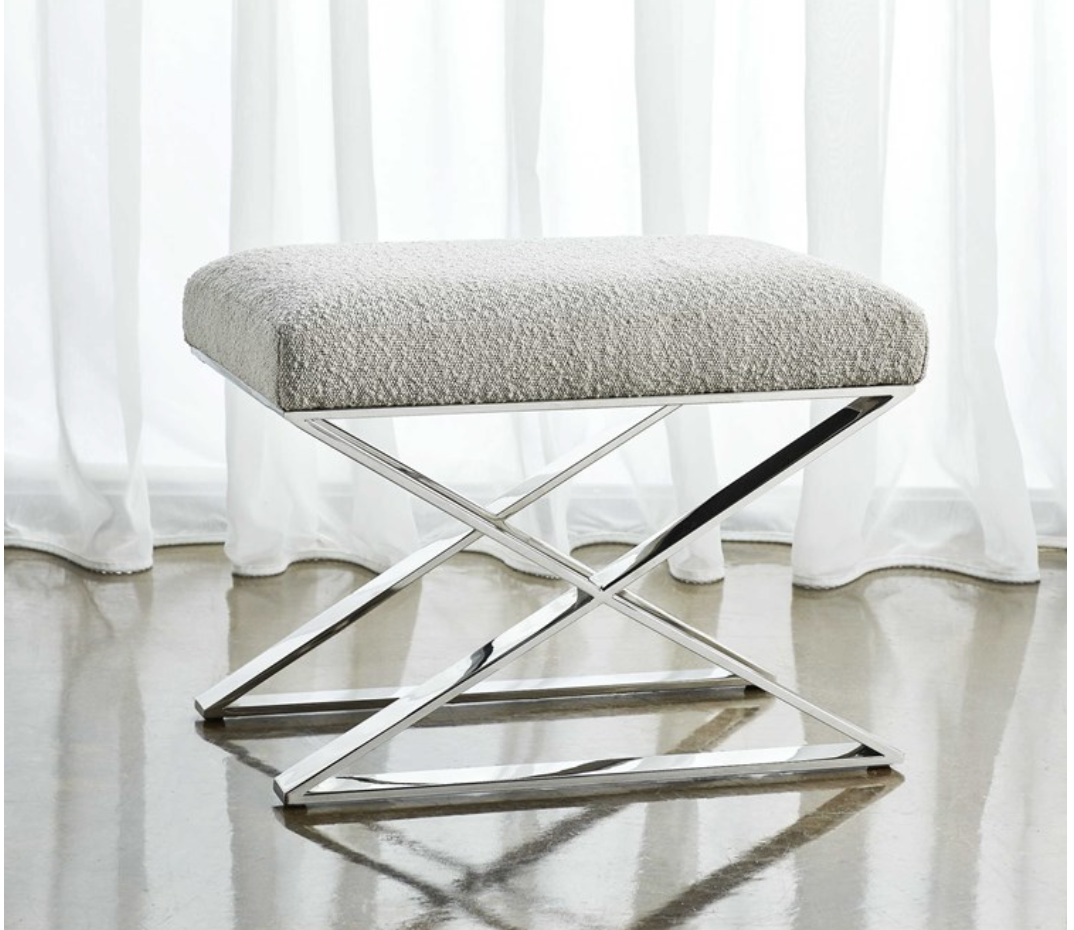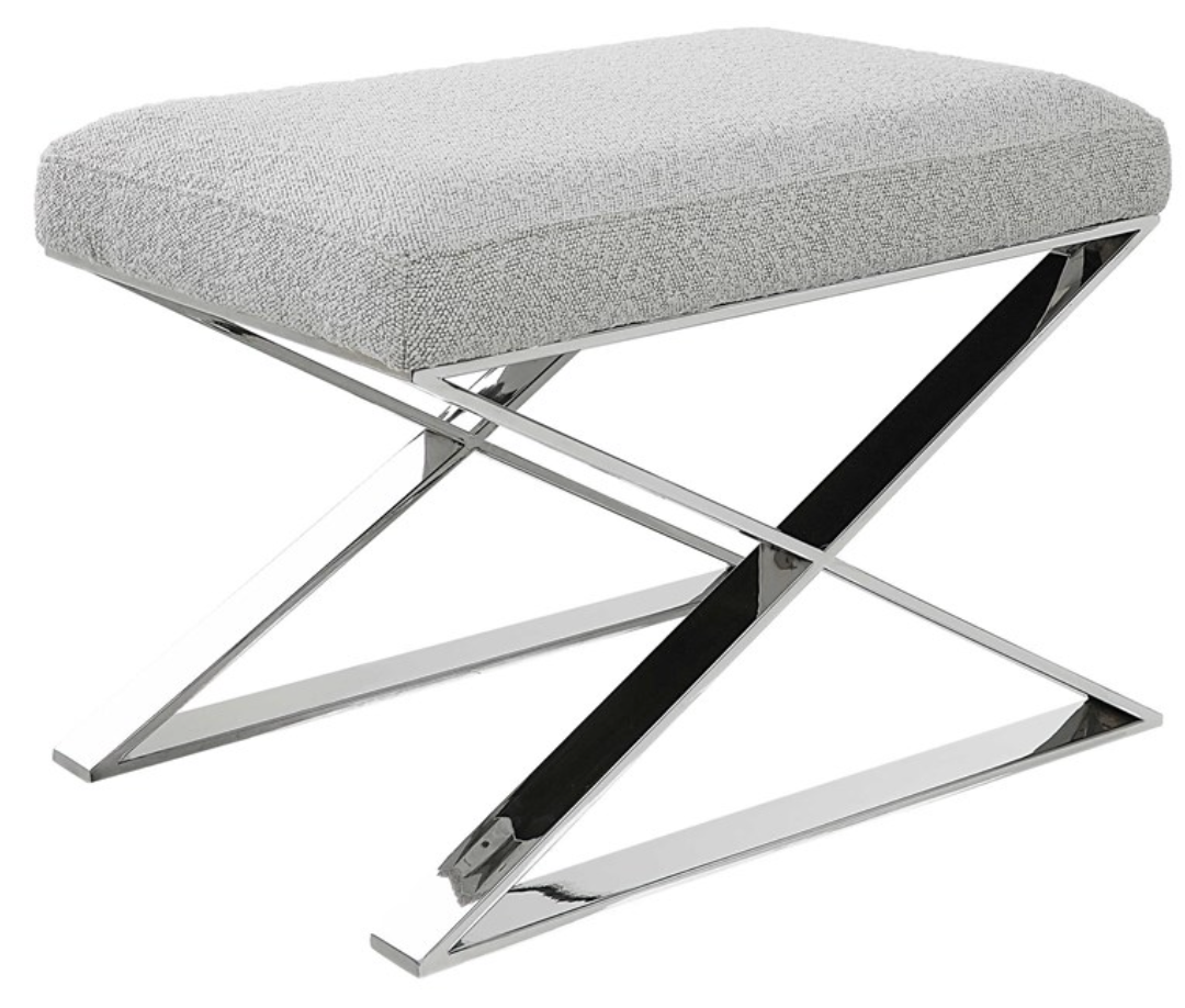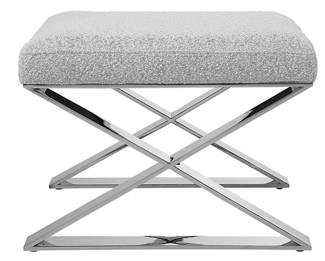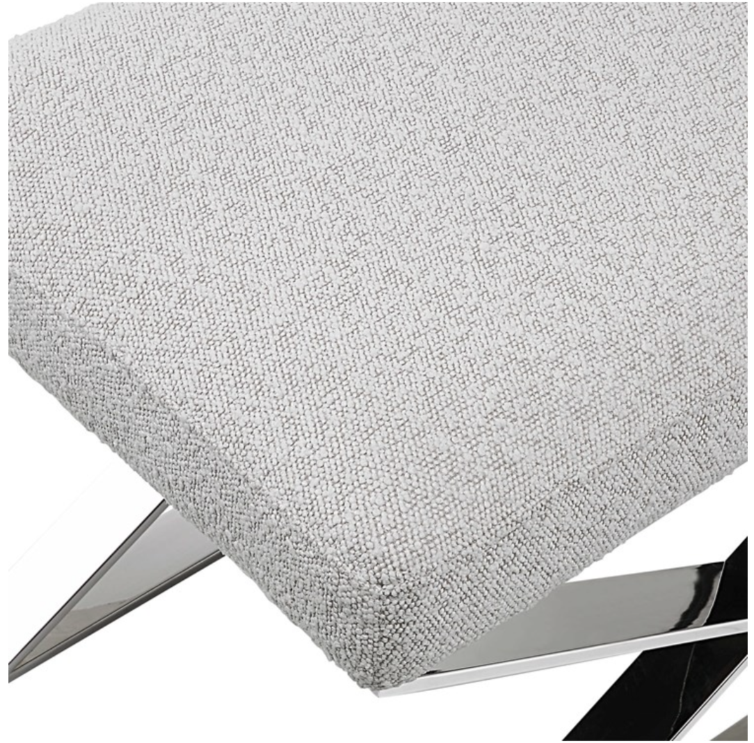 A sumptuous ivory boucle cushion rests atop this streamline steel base with polished chrome finish. The seat size is generous, yet its overall proportions are small enough to fit in a variety of locations. Seat height is 20".