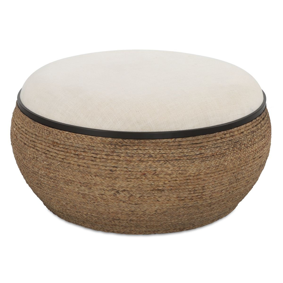 A unique blend of casual and coastal styles, this ottoman is a versatile storage piece with a removable lid. Can be used as seating, a footrest, or cocktail table. The round base is wrapped in natural braided straw with matte black iron details and a plush upholstered seat in light beige performance fabric.