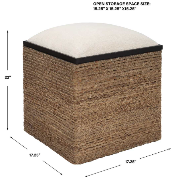 A unique blend of casual and coastal styles, this accent stool serves as a multifunctional storage piece with its removable lid. Can be used as extra seating or a pulled up as a footrest. The square base is wrapped in natural braided straw with matte black iron details and a plush upholstered seat in light beige performance fabric.