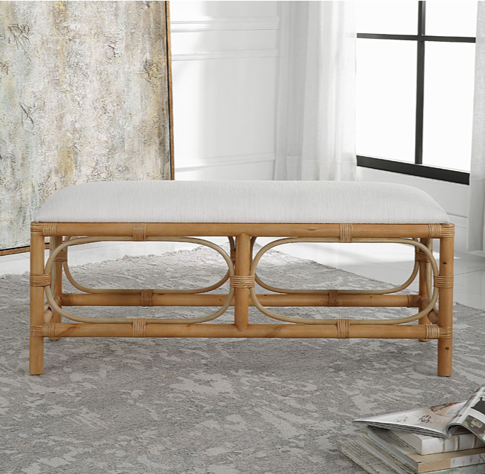 A refreshing coastal accent featuring a crisp white textured fabric, over a naturally finished solid wood base with rattan wrapped accents. Perfect at the foot of a bed or as additional family room seating.