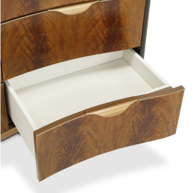 The Malibu Crest Dresser is the picture of modern class. Everything speaks to beauty and quality, like the dresser’s scalloped shaped front, the Pre-Dyed Swirl Mahogany veneer and graceful waterfall handles. Crafted with hardwood solids and cultured marble, and featuring a false-bottom hidden storage compartment, this set is certain to match your chic taste.