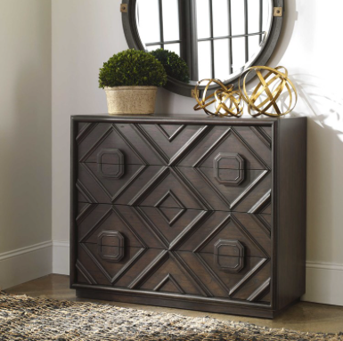With a transitional deep walnut finish over mindi veneer, naturally distressed and hand rubbed to expose natural undertones, this four drawer chest features an updated geometric carved molding front over a floating plinth base.