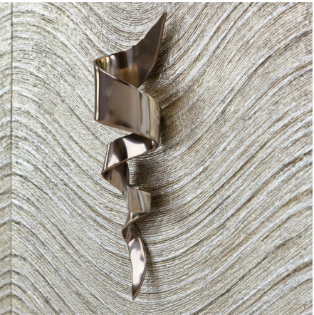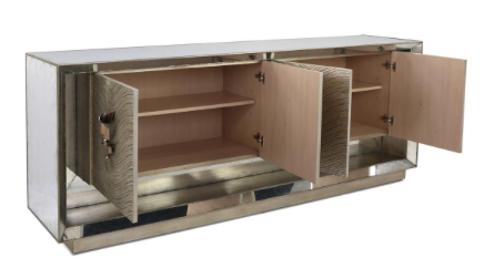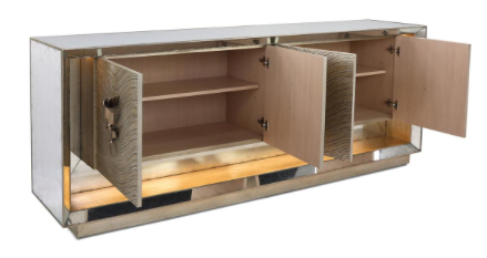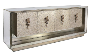 The Moon Shadow Sideboard is a gorgeous statement piece that delivers stunning visual texture to an interior space. An oak wood frame in Silver White showcases a delicate profile overlain with reflective églomisé glass panels. Beveled edges outline four doors with curvaceous motifs in a Striated Silver finish, displaying spiraling steel handles in Dark Nickel. Two interior compartments each feature an adjustable shelf, complete with dimmable LED lighting.