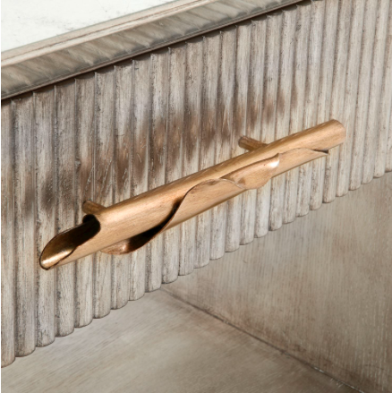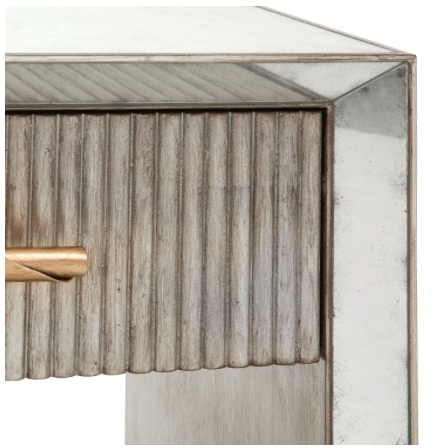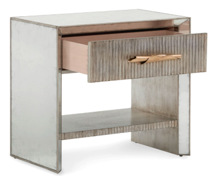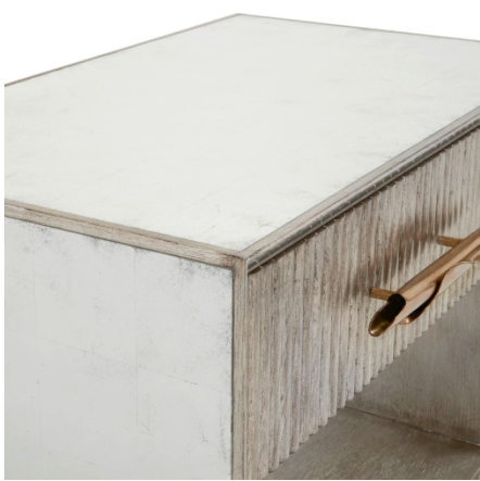 The Moon Shadow Nightstand is a gorgeous statement piece that delivers stunning texture to an interior space. An oak wood frame features a delicate profile overlain with mirrored glass. Beveled edges outline the drawer, showcasing a fluted pattern in a Silver White finish, matched by subtle accent along the open-air shelving. The metallic handle features a spiraling motif finished in Valyrian Gold, playfully contrasting the angular body.