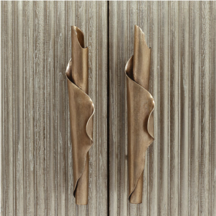 The Moon Shadow Sideboard is a gorgeous statement piece that delivers stunning texture to an interior space. An oak wood frame features a delicate profile overlain with mirrored glass. Beveled edges outline the four push latch drawers with a fluted pattern in a Silver White finish. Two center doors feature metallic handles with a spiraling motif finished in Valyrian Gold, playfully contrasting the angular body. This piece is equipped with an adjustable shelf within its interior compartment.