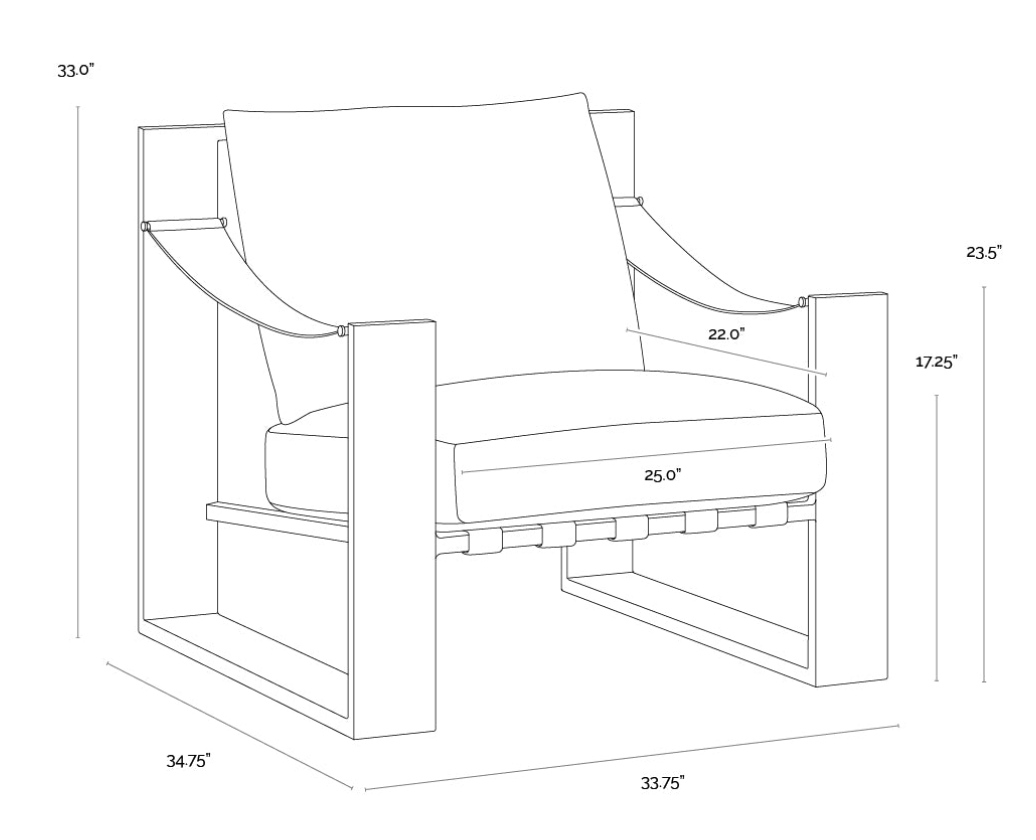 The Berke Lounge Chair brings an impressive modern look. Soft cushions are upholstered in buttery tan leather with matching leather strap detailing. A strong iron frame lends this lounge chair a bold, geometric design.