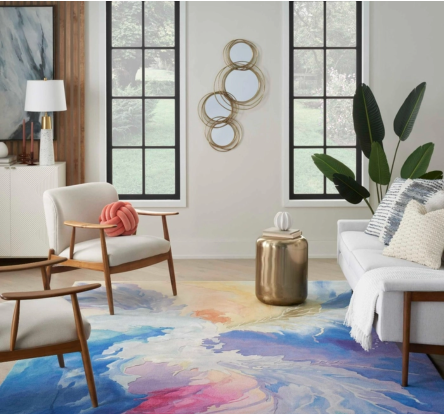 Add a unique burst of pattern to your home with this abstract rug from the Prismatic Collection. Splashes of painterly blue, purple, yellow, orange, and green tones curve along the surface, creating a vibrant sense of movement designed to spark conversation. With carved details and shimmering accents, this modern rug is a standout addition to your living room or bedroom dcor. Made from a luxuriously soft blend of New Zealand wool and silk-like Luxcelle.