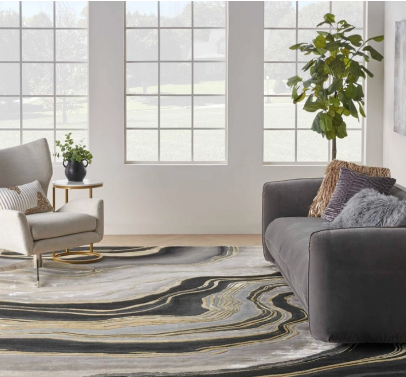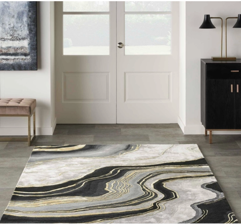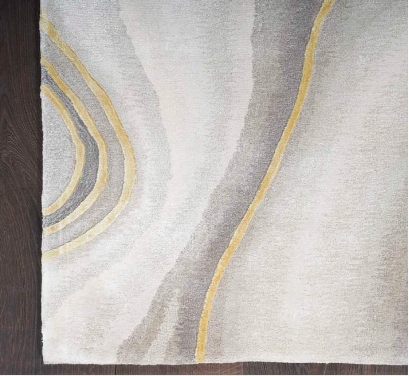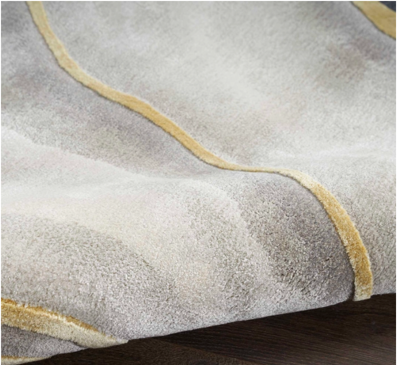 Bring bold, dramatic style to your home with this abstract rug from the Prismatic Collection. Hand-carved gold swirls punctuate shades of grey and black, adding a stunning level of dimension to your living room or bedroom. Handmade from fabulously textured New Zealand wool with silky Luxcelle accents that beautifully capture changes in light.