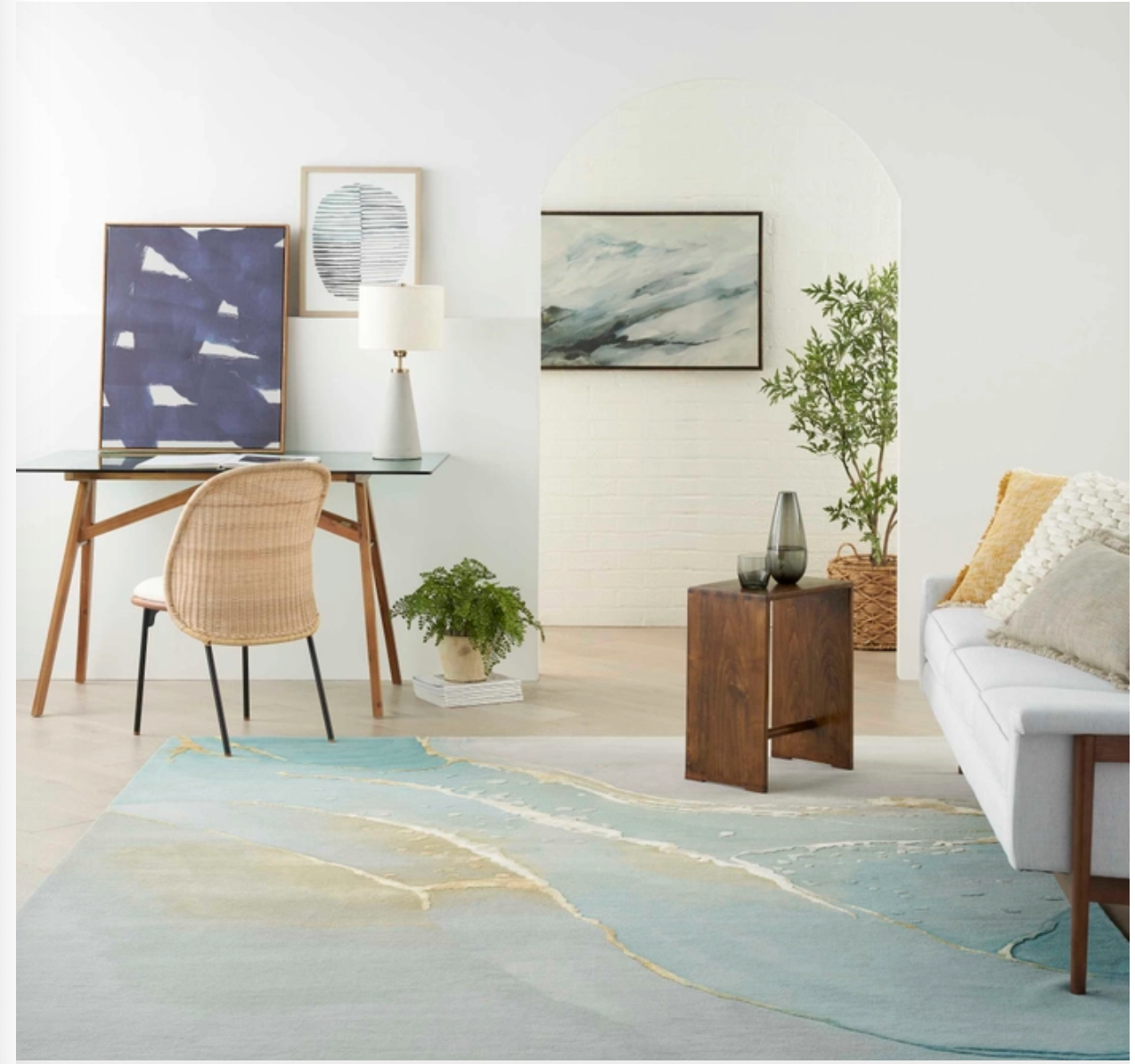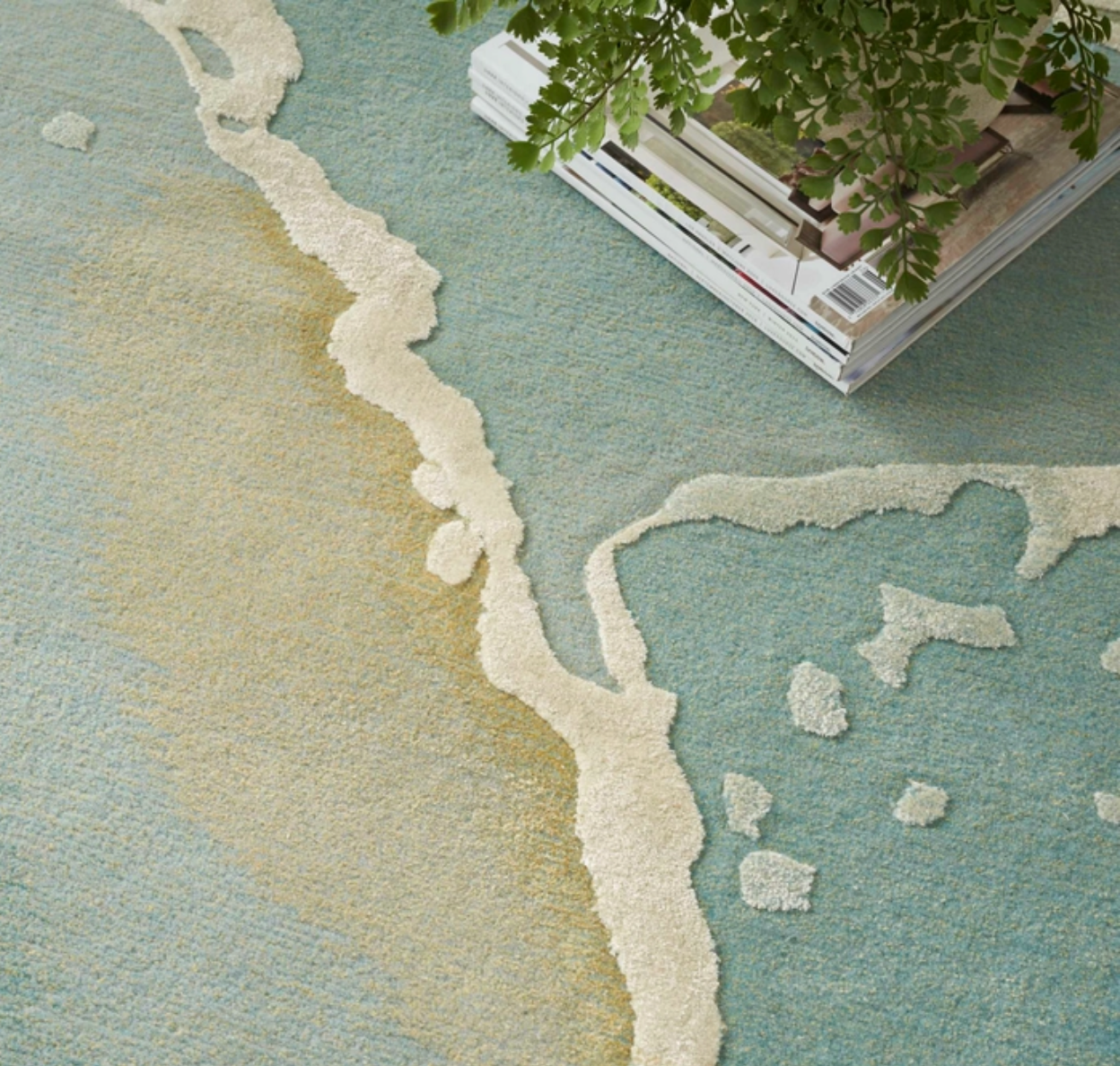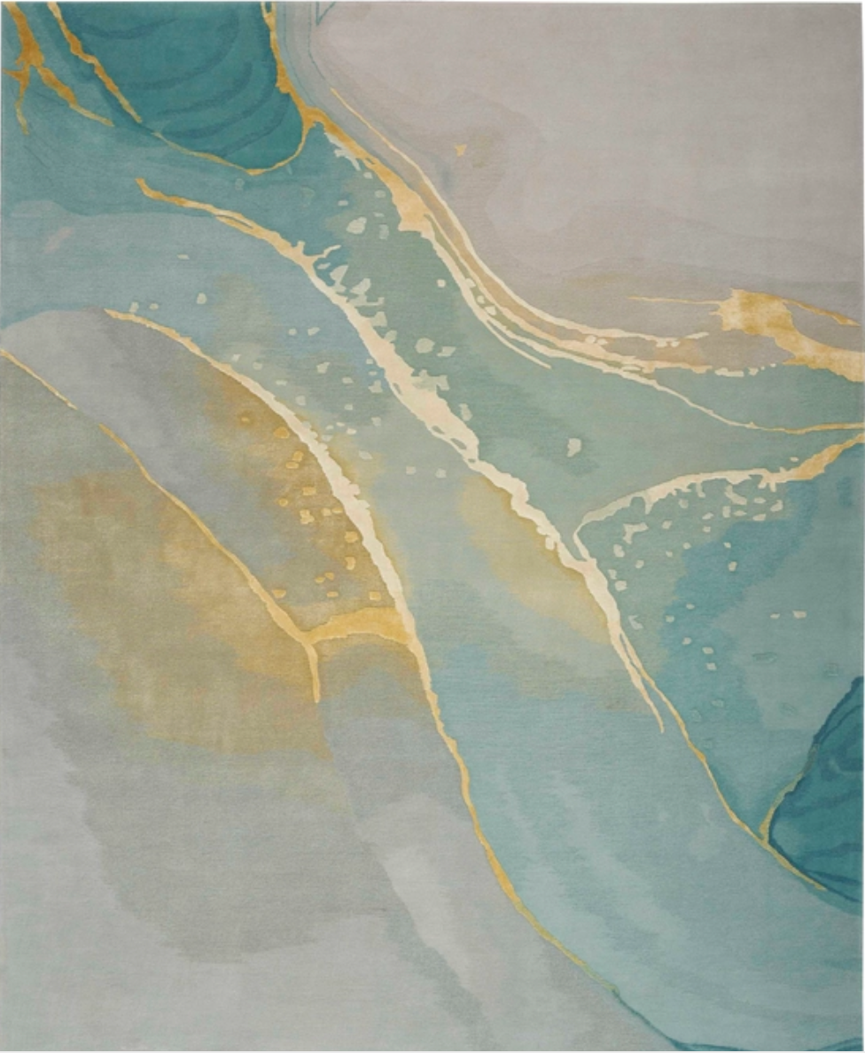 Evoke a sense of calm with this modern rug from the Prismatic Collection. Abstract ripples of grey and blue are accented by swirls of gold that seemingly radiates from its softly hued ground. Hand carved for an added sense of depth, its a standout foundation for your living room or bedroom decor. This handmade rug is crafted from a fabulously textured blend of New Zealand wool and silky Luxcelle.