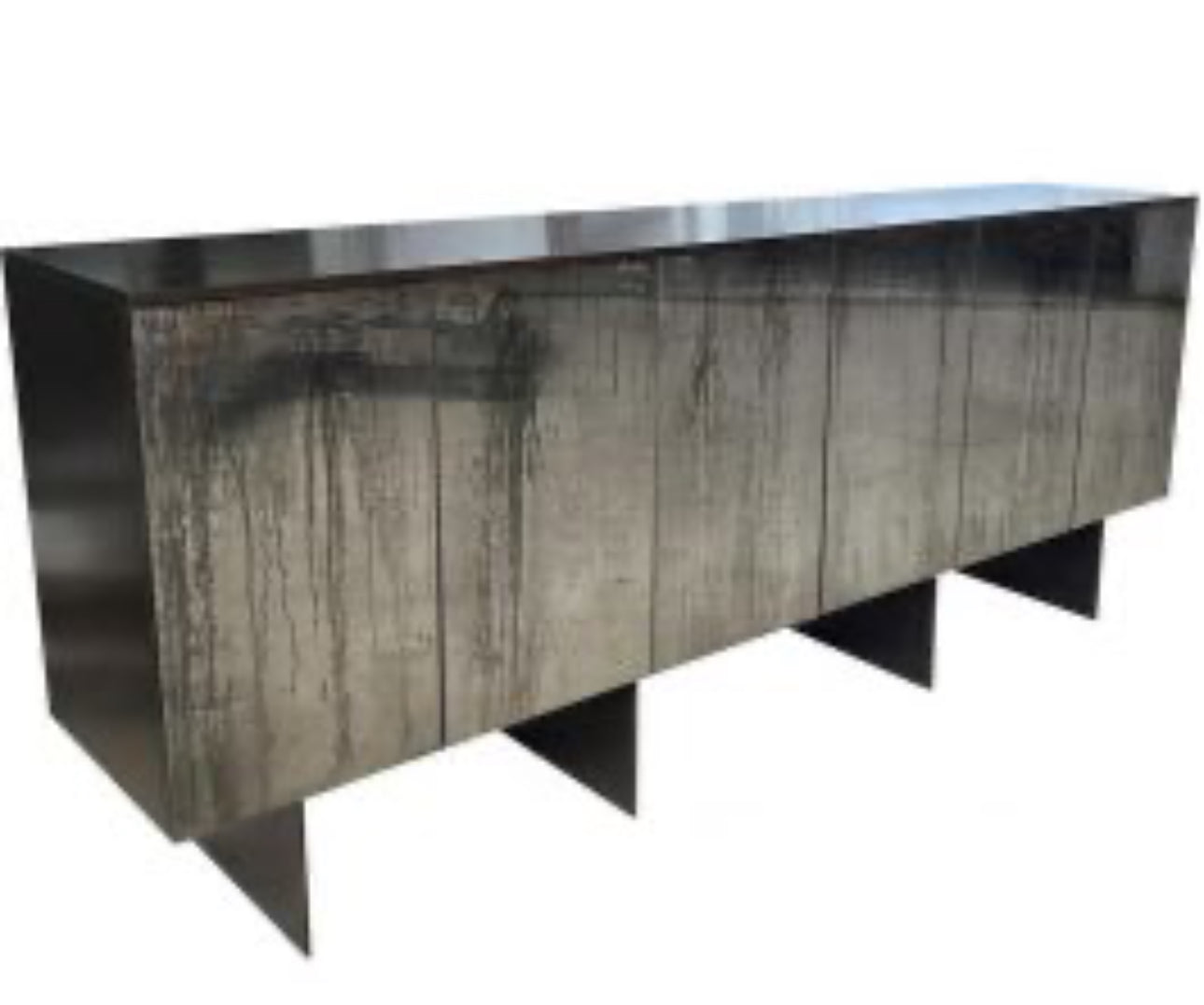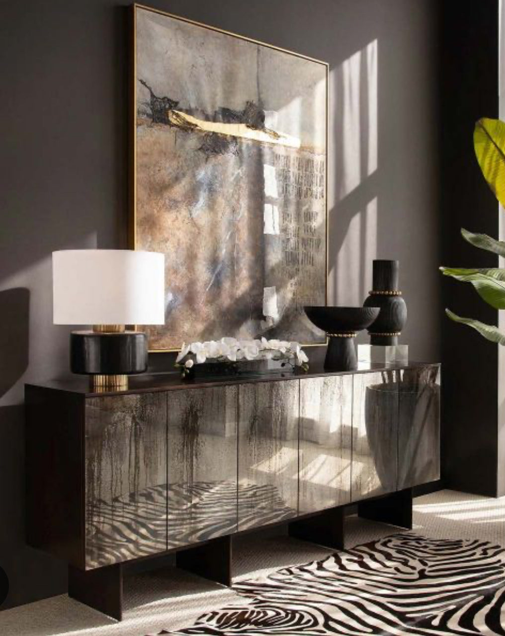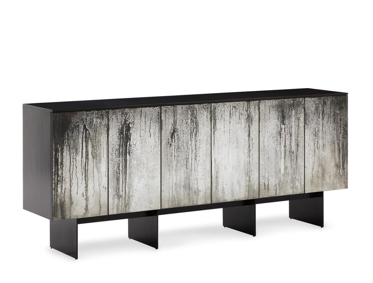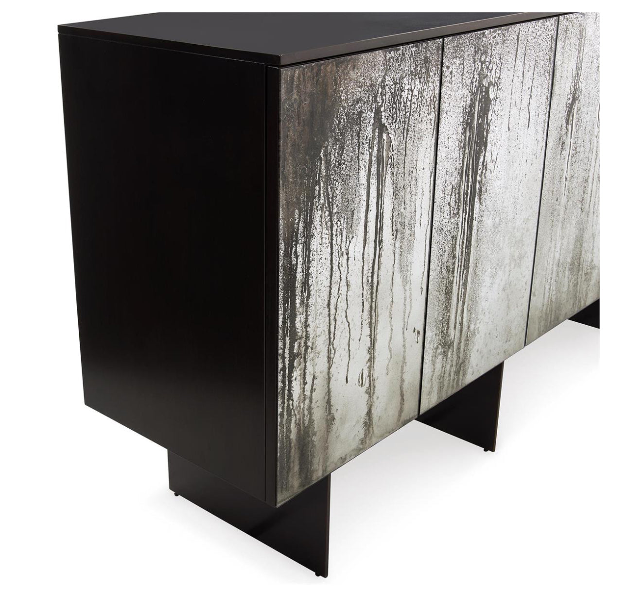 The Rainfall Sideboard features a sleek contemporary design that communicates a dignified sense of sophistication to an interior space. A rectangular wooden frame in an Espresso finish is complemented by slender steel legs in Sculpture Bronze. Panes of reflective glass adorned in an antiqued trickle effect are showcased across the six doors, lending a wealth of textural depth to the piece. This tasteful design statement features push-latches equipped with European hinges, as well as an adjustable shelf within its three interior compartments.