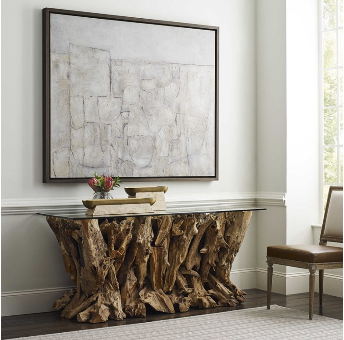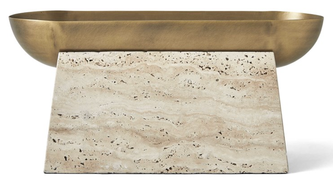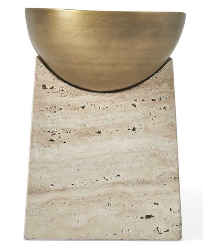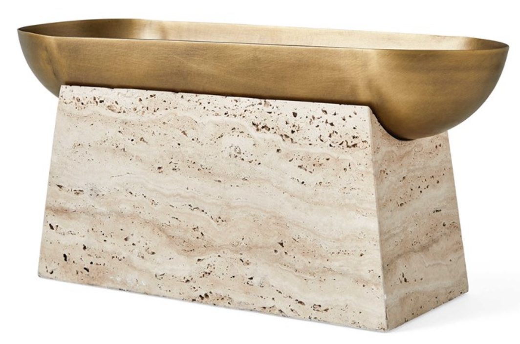 The luster of a smooth metal bowl, highlighted by its light antique brass finish, creates the perfect counterpoint to a textured pedestal carved from beige unfilled travertine. This decorative bowl holds so much potential, as a dramatic statement centerpiece or the most artful catchall ever. If using with plants that require water, a liner is recommended.