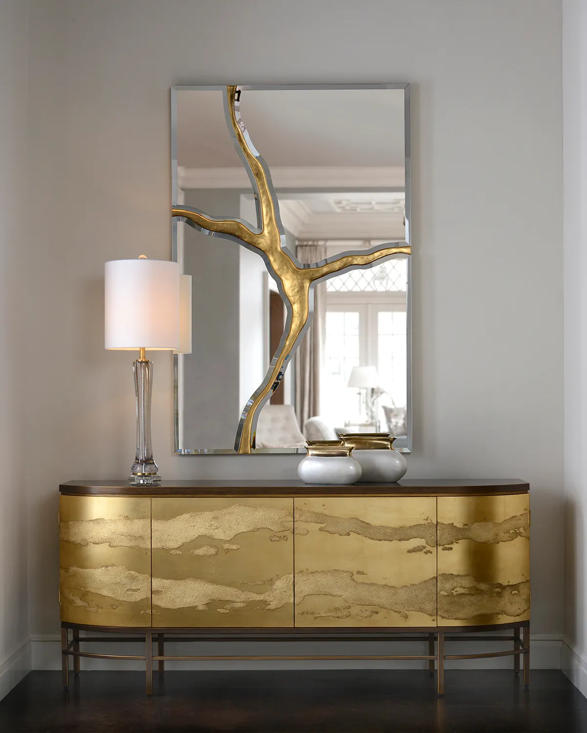 The Ravine Mirror is a gorgeous statement piece that features four hand-carved beveled mirrors with a cracked motif against a backdrop of Exotic Gold. This stunning piece can be displayed in both vertical and horizontal orientations.