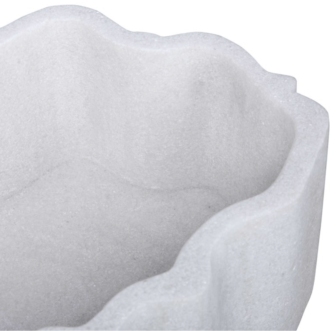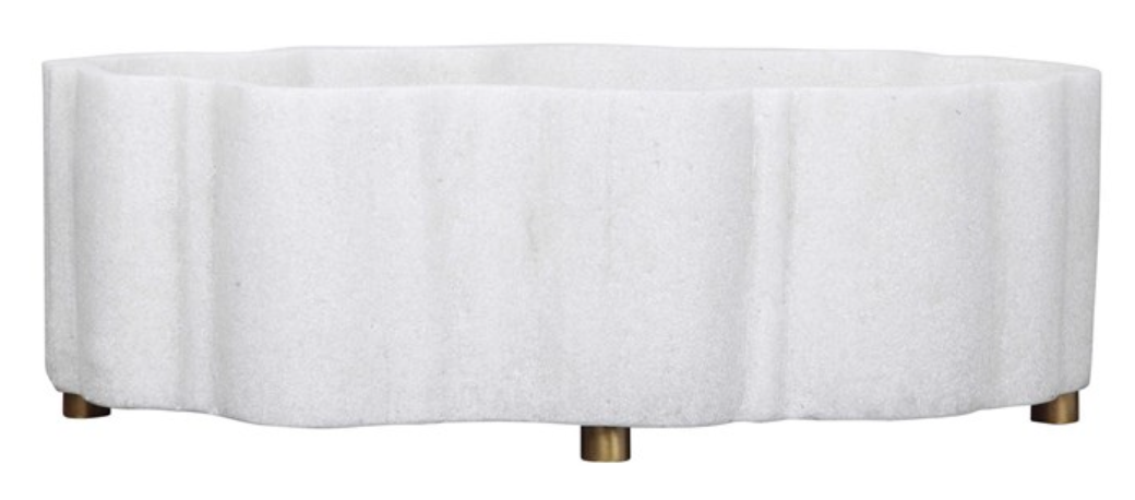 An unexpected and delightful shape provides a statement piece that has many purposes. Overscale cachepot is designed to hold 3-4 standard 6" high pots, making it a perfect place to showcase orchids or other favorite plants. Crafted from ivory man-made stone that accurately replicates the look of Thassos marble.