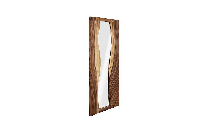 The combination of gleaming mirror and warm wood makes the River Chamcha Wood Mirror a contrast in materials. We’ve designed the decorative mirror so that it is as much a piece of wall art as it is a looking glass. The panels of chamcha wood that flow along the sides of the rectangular mirror have a beautiful waviness to the grain that Mother Nature is so adept at achieving. This is one of our pieces that illustrates how we use nearly every length of the trees we harvest when we rescue them from being Nature’s finest castaways. The juxtapositions in this design reflect the ethos that Phillips Collection personifies: modern organic.