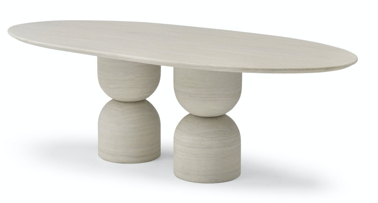 The Rocca Dining Table is a refined blend of natural beauty and architectural design. Its oval beige travertine marble top, finished in a smooth matte surface, rests on two sculptural bases with fluid, curved forms that create a sense of balance and rhythm. The soft lines and solid stone highlight the elegance of travertine while giving the table a contemporary, sculptural presence. A centerpiece that embodies modern luxury, Rocca brings both functionality and artistic character to the dining space.