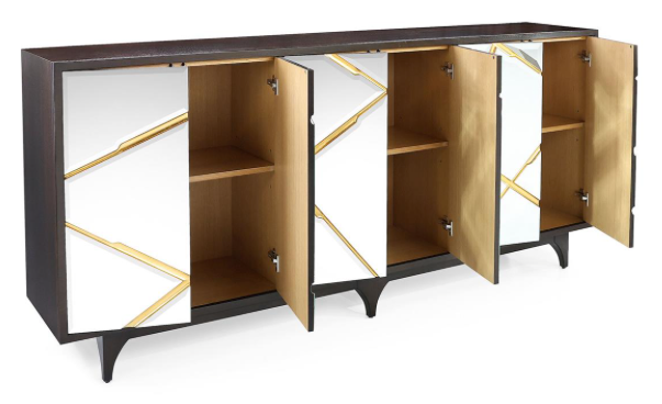 The Ronin Sideboard is a sharp, sleek offering that exudes contemporary charm. An oak wood frame in a Smoked finish contains six doors adorned with beveled mirrors, featuring dimensional striations at varying angles in an Exotic Gold finish. The sideboard sits atop six elegantly tapered legs and features three interior compartments with adjustable shelves.