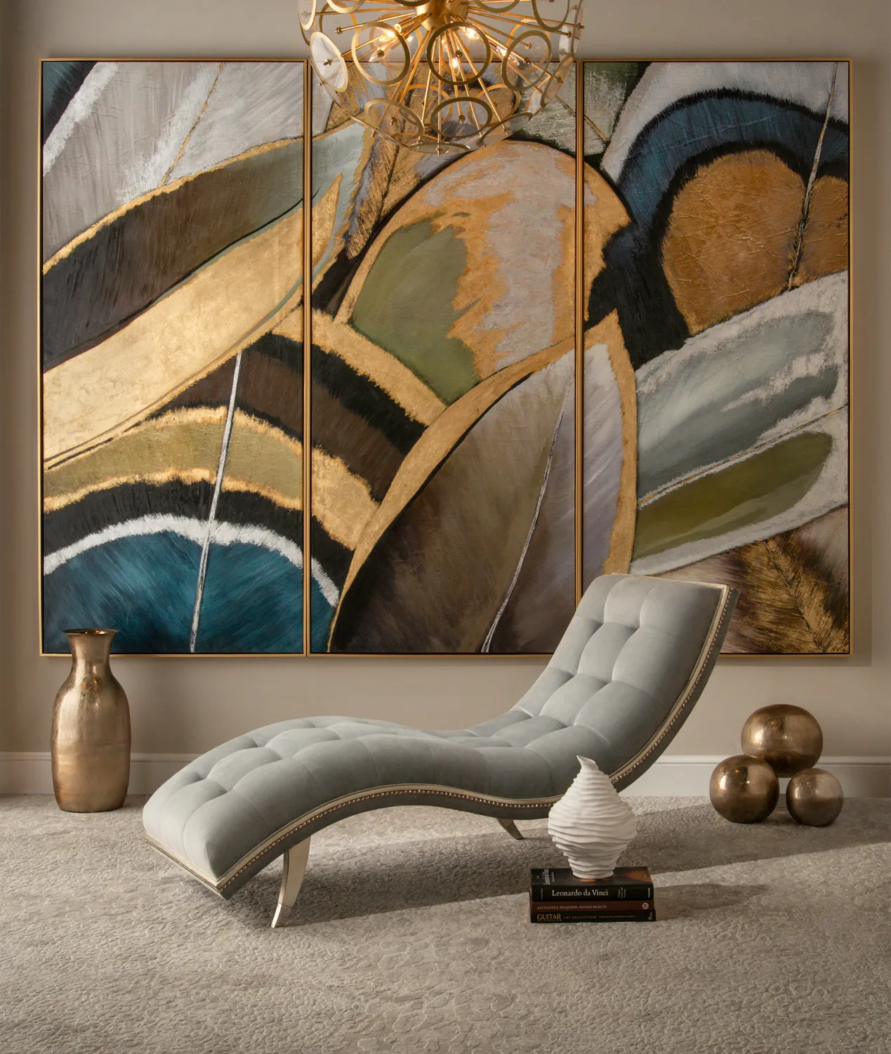 Small Feathers by artist Shaye Rawson is a triptych featuring an overexaggerated abstract of feathers. The gold and silver leaf highlight the feathers, and the gloss medium brings the feathers to life. This piece is surrounded by a gold floater frame. This piece is available in the John-Richard Custom Art Program. Please contact your sales representative for more information.