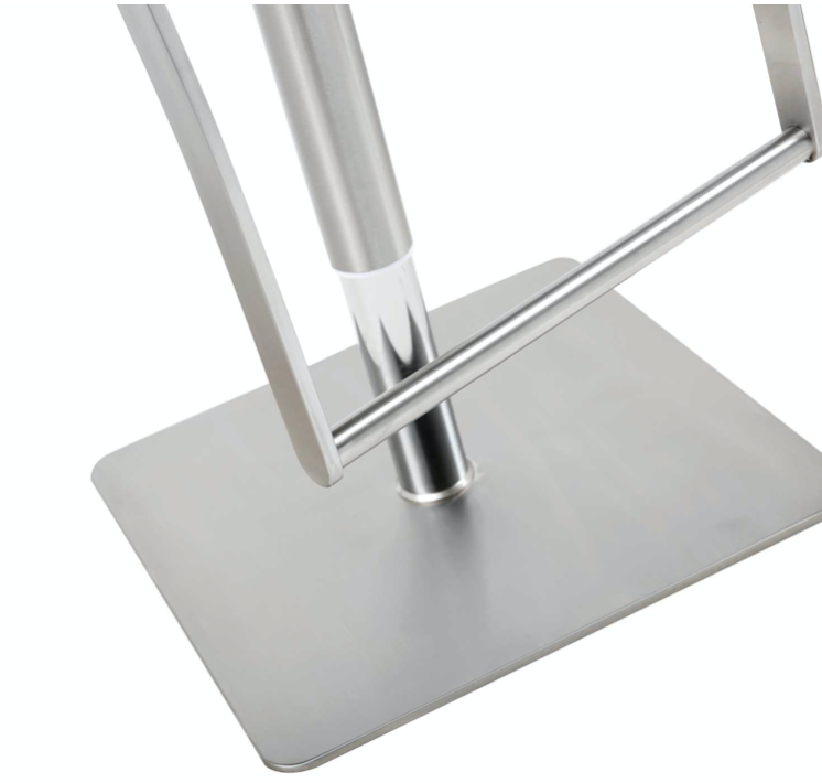 The curved stainless steel armrests, embellish the Shell barstool, yet maintain their silent elegance intact. Available in Taupe Faux Leather or in White Faux Leather, Adjustable Height with Gas Lift, Armrests and Silver Stainless Steel Square Base with Long Footrest.
