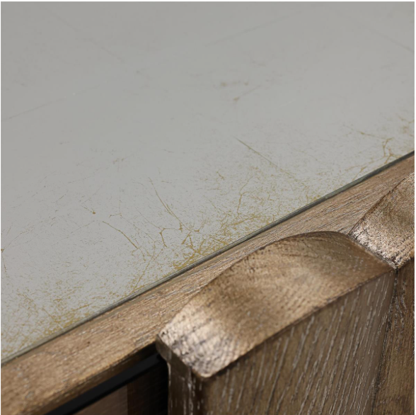 The Soleil Four-Door Credenza is crafted from oak veneer in a Gold White finish, its curved silhouette defined by vertical fluting that lends the piece a sculptural presence. The design is anchored by bronze tempered glass doors beneath an eglomise glass top with a distressed gold backdrop. Slender stainless steel handles in a Brushed Brass finish form a striking focal point along the central doors, their elegant contours standing in stylish contrast to the vertical fluting. The interior features dimmable LED lighting, a central compartment with an adjustable shelf, and two outer compartments with fixed shelving. Adjustable glides are included for ease of placement.