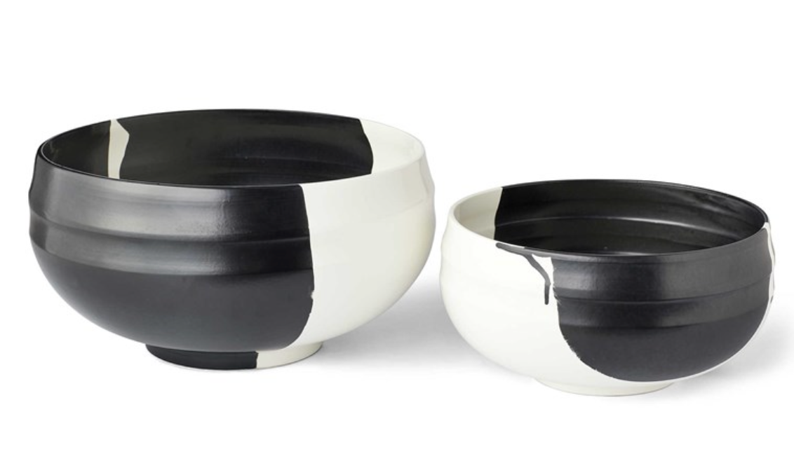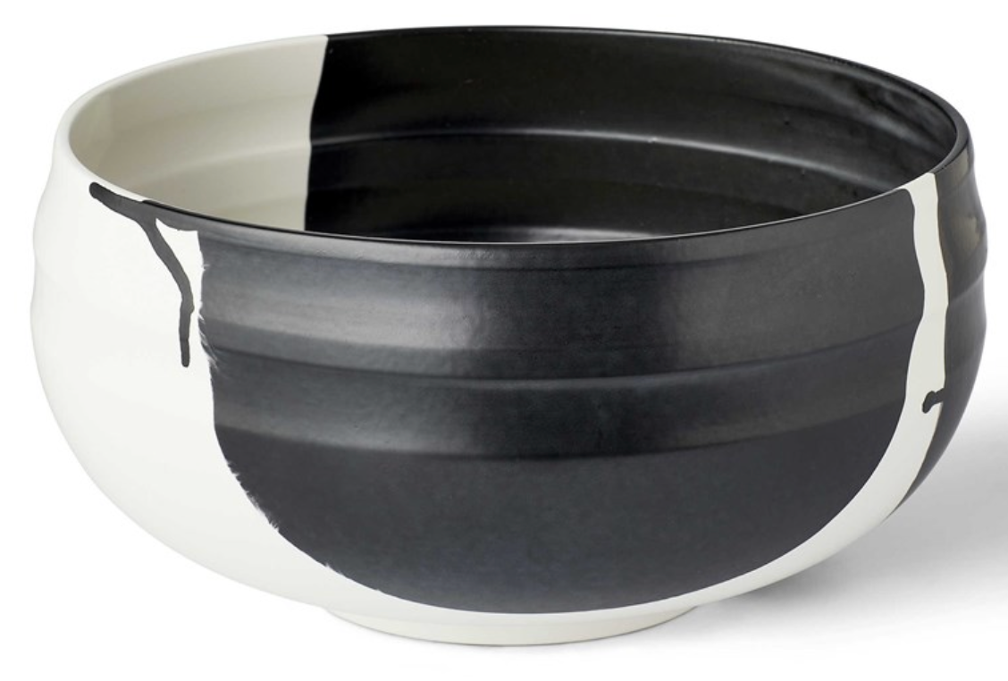 The Split Personality bowl is an oversized centerpiece that makes a big statement. The hand-dipped matte glaze in black and white has a strong graphic quality. Works great as a centerpiece bowl on a kitchen island, cocktail table, or console.
