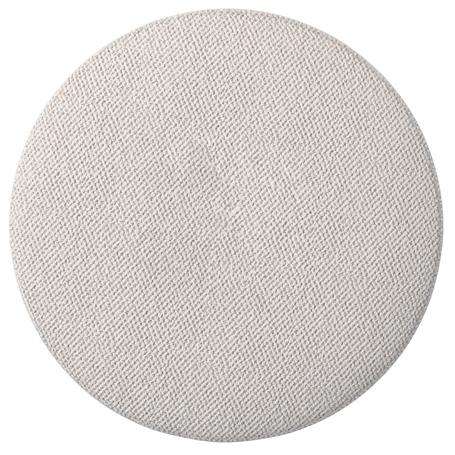 The Stratum bench showcases a distinctive wooden base formed with curved sections and straight lines and finished in Mist. The geometric design supports a round seat with an upholstered top and sides.